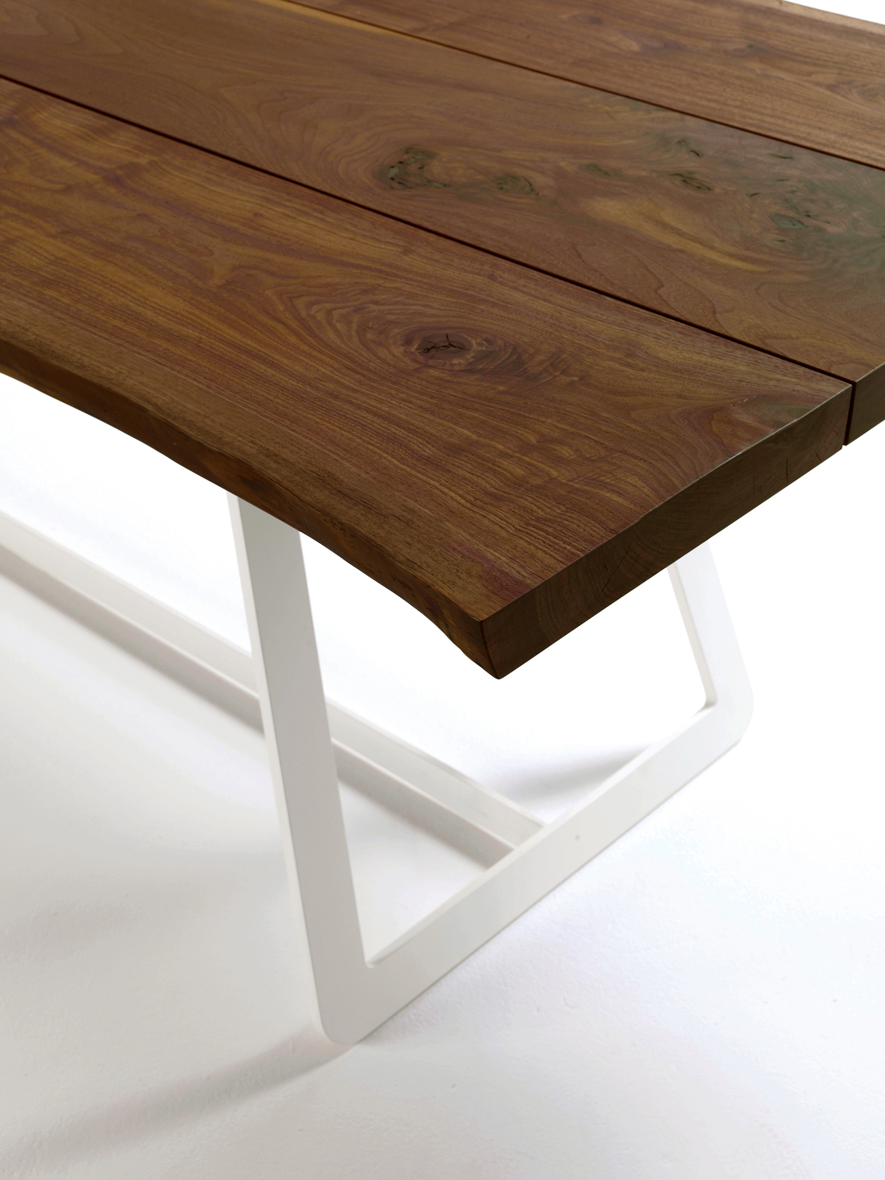 Tavolo con top realizzato in legno massello a liste accostate con bordi naturali, abbinato ad una struttura in ferro composta da due gambe a slitta e barra centrale.