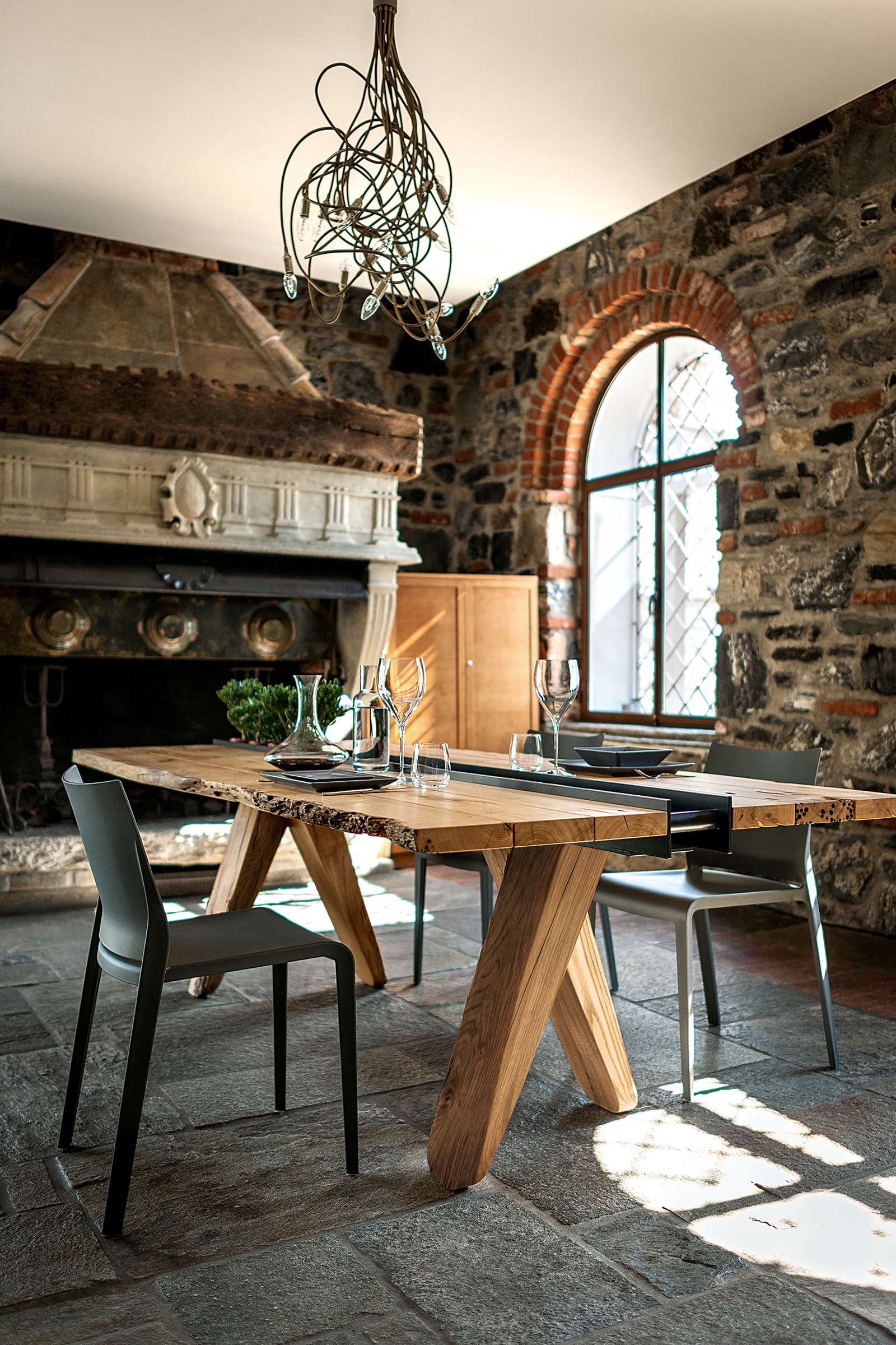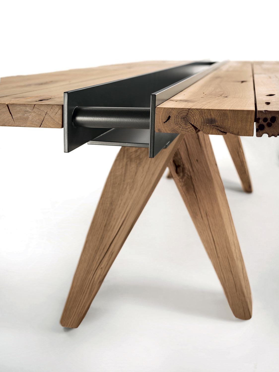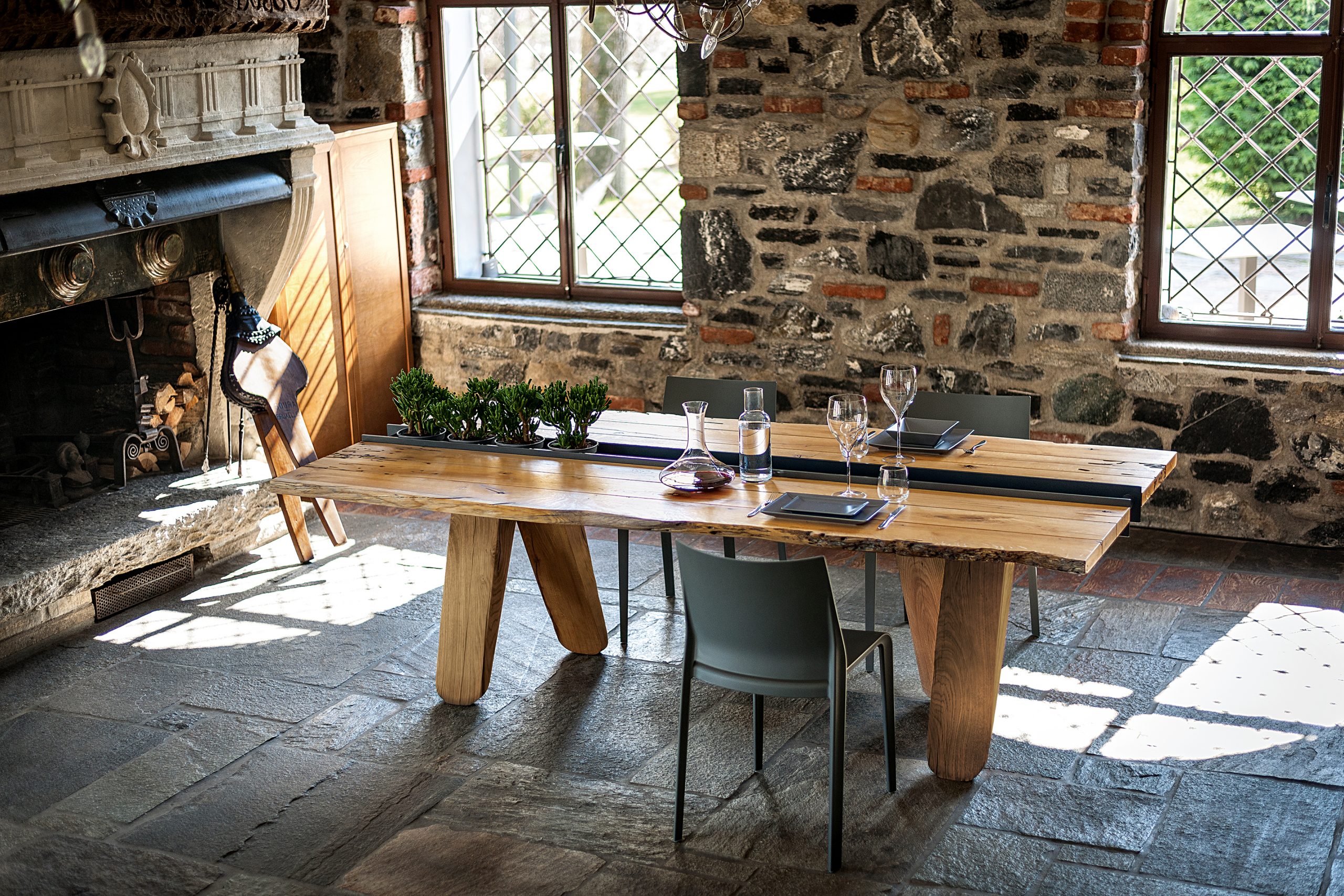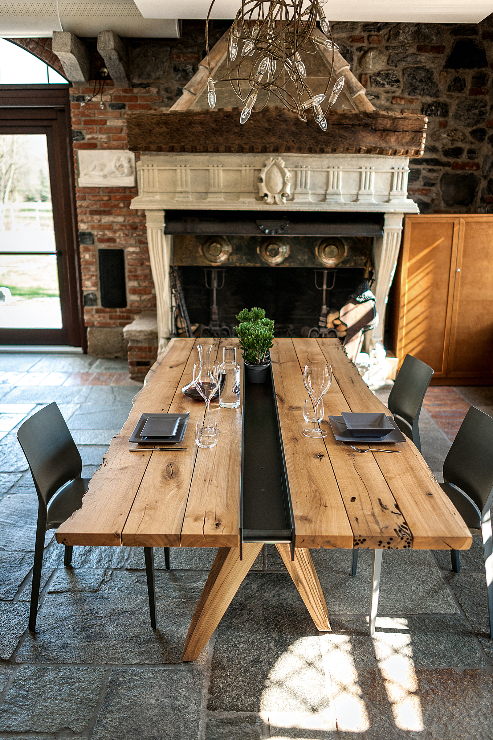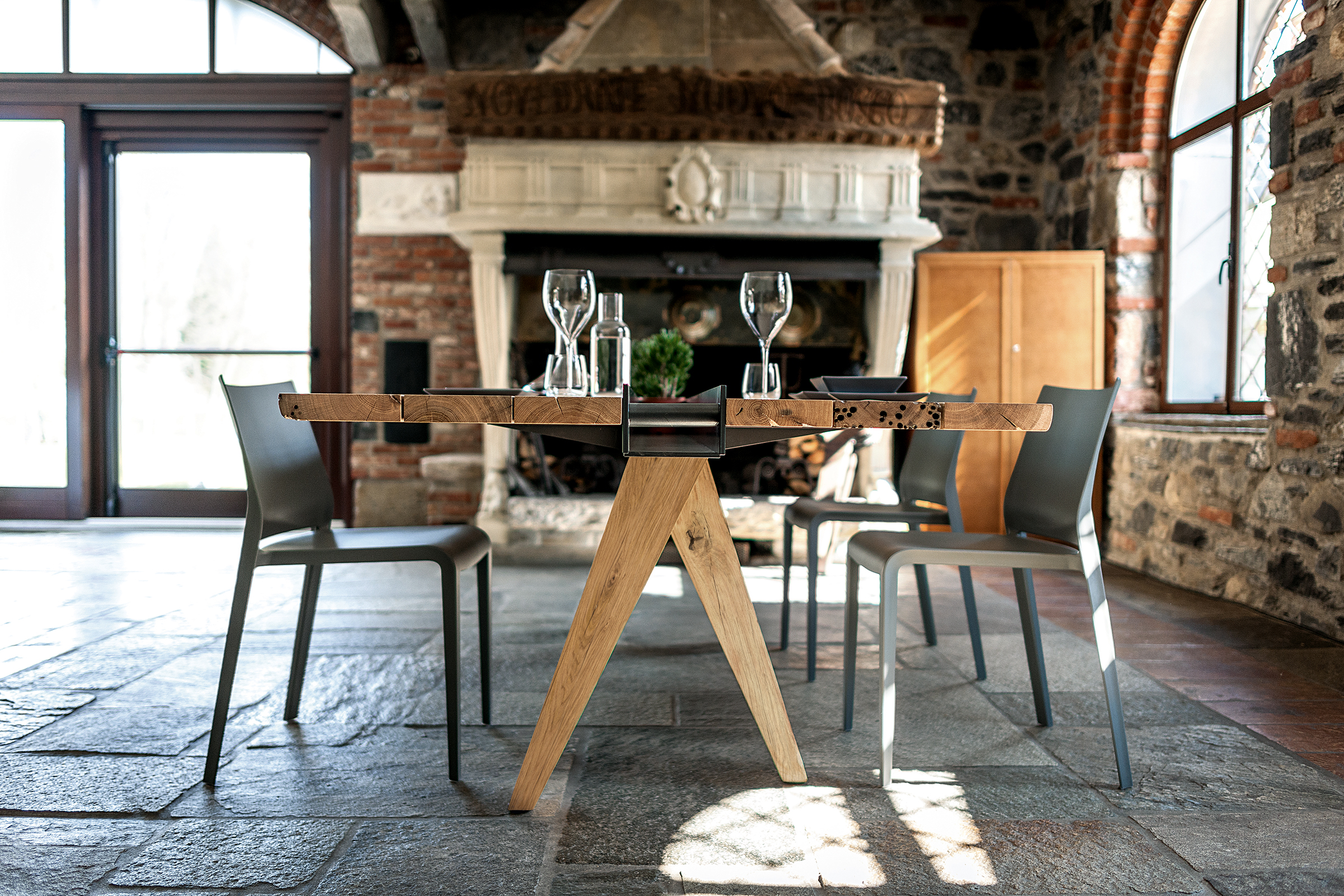 Tavolo con top realizzato in legno massello di Briccola, a liste accostate con fughe e lati naturali. Dotato di vano centrale in ferro con funzione contenitiva. A sorreggere il piano quattro possenti gambe a sezione geometrica.