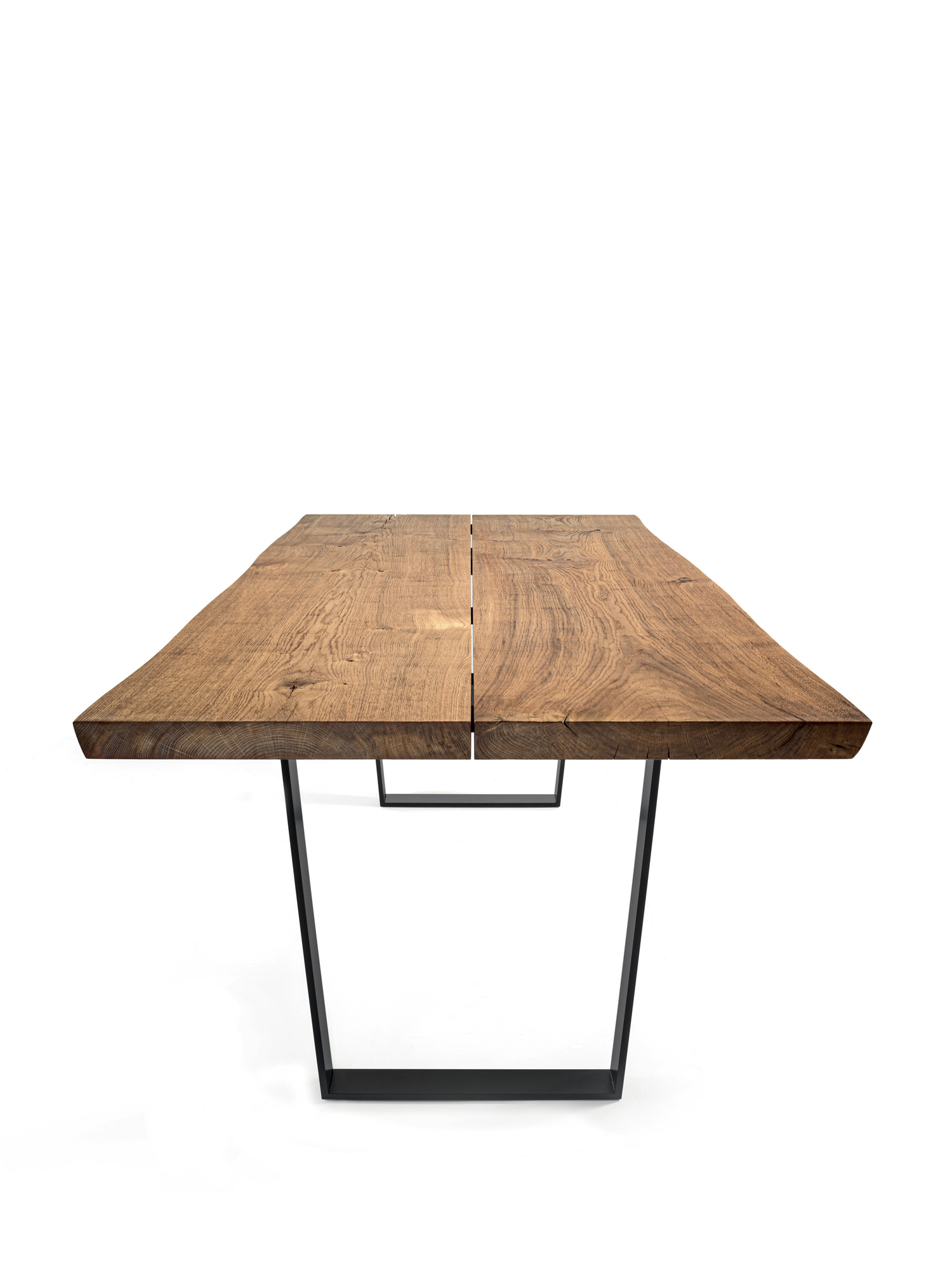 Tavolo con top in legno massello composto da due tavole uniche con fuga centrale e bordi naturali, caratterizzato da base in ferro con gambe a slitta assemblate con incastri a coda di rondine.