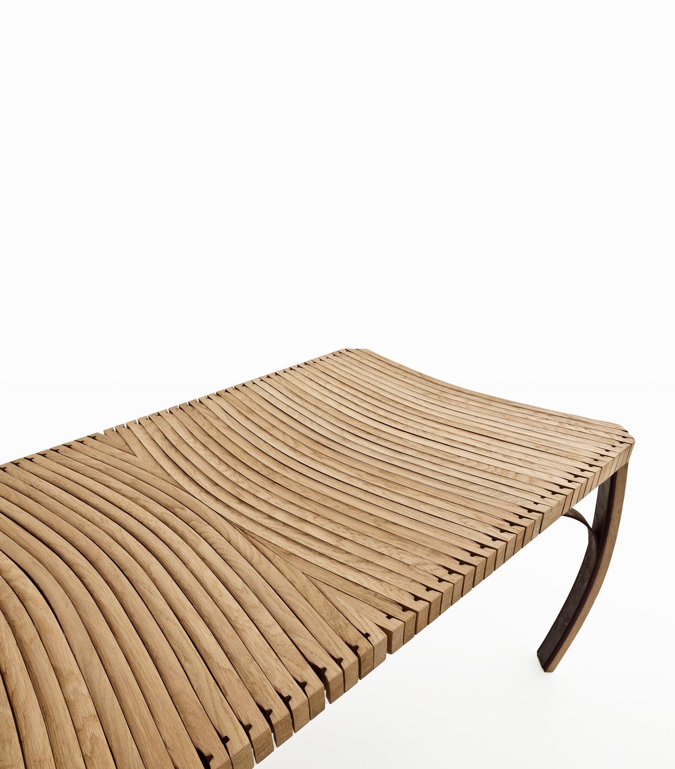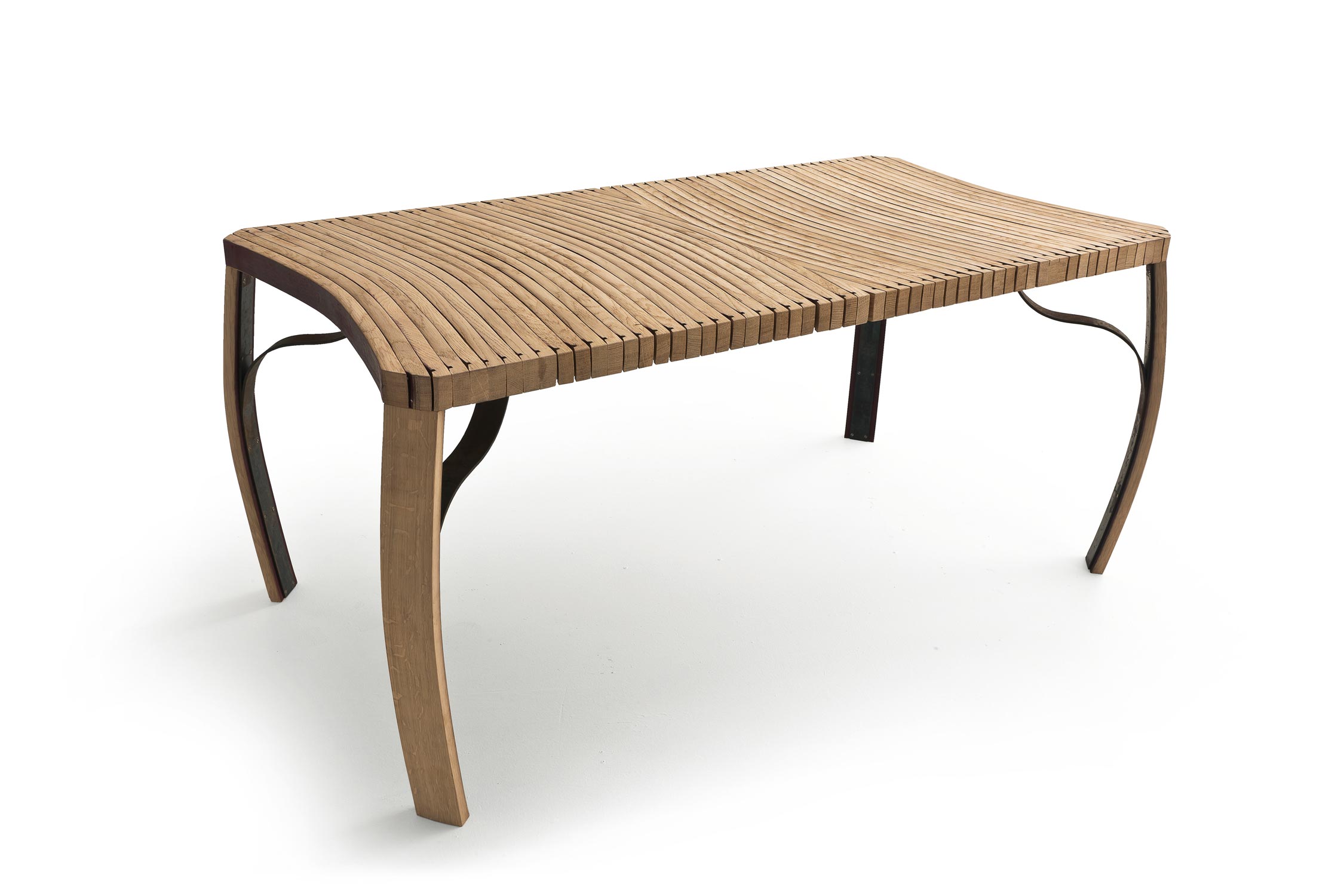 Tavolo con top ottenuto dall’accostamento delle doghe in legno di rovere, provenienti dalle Barrique. Le doghe ne caratterizzano anche la forma curvilinea delle gambe.