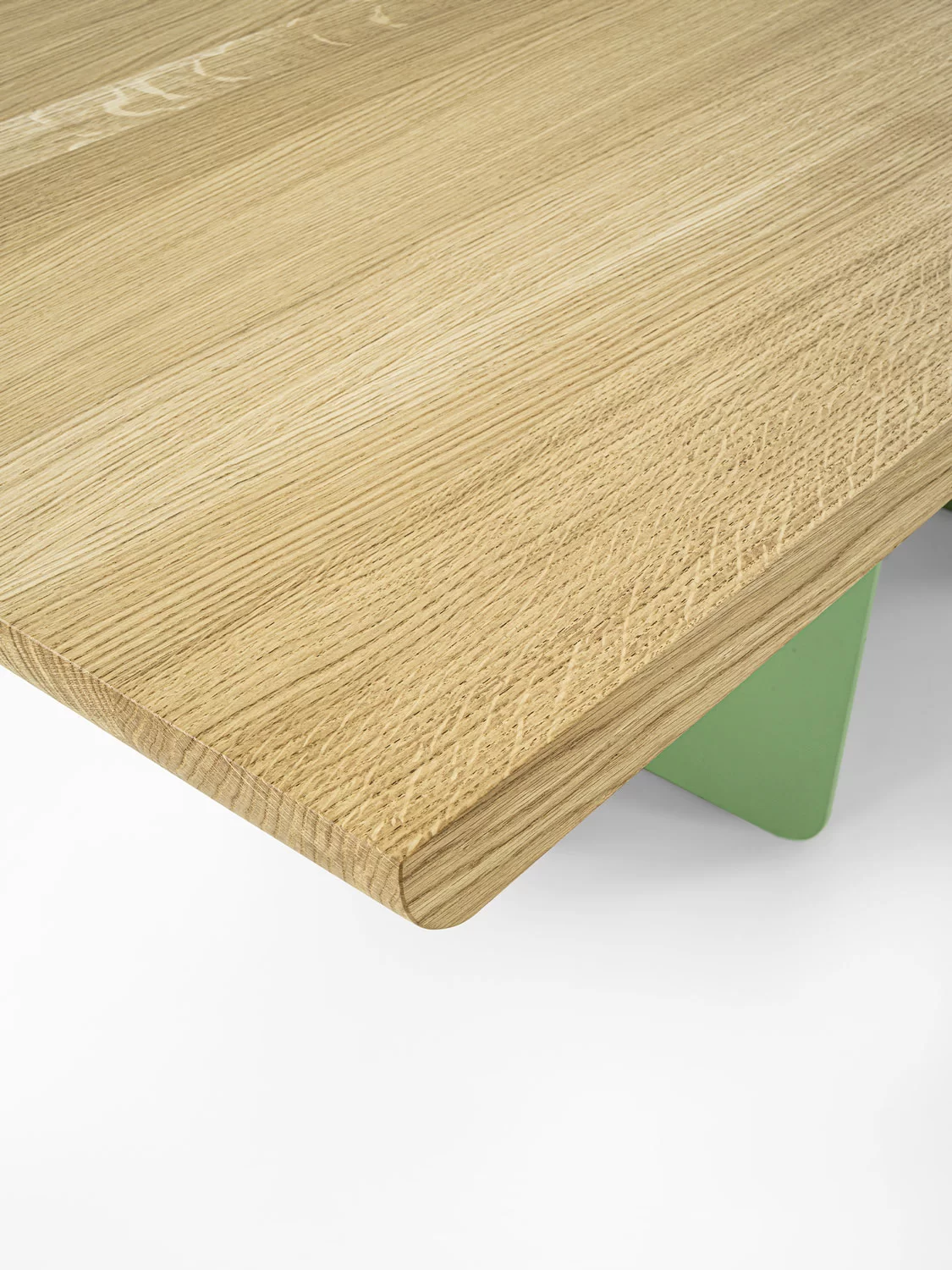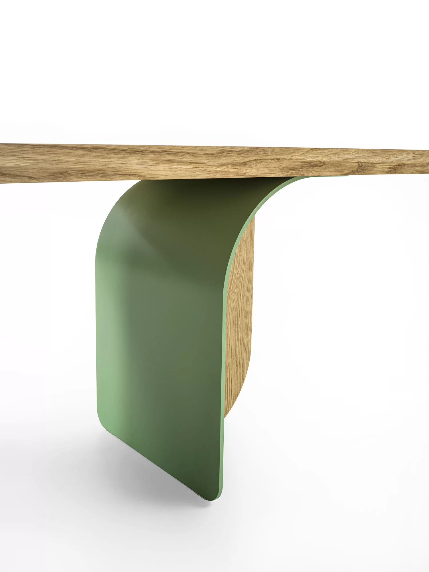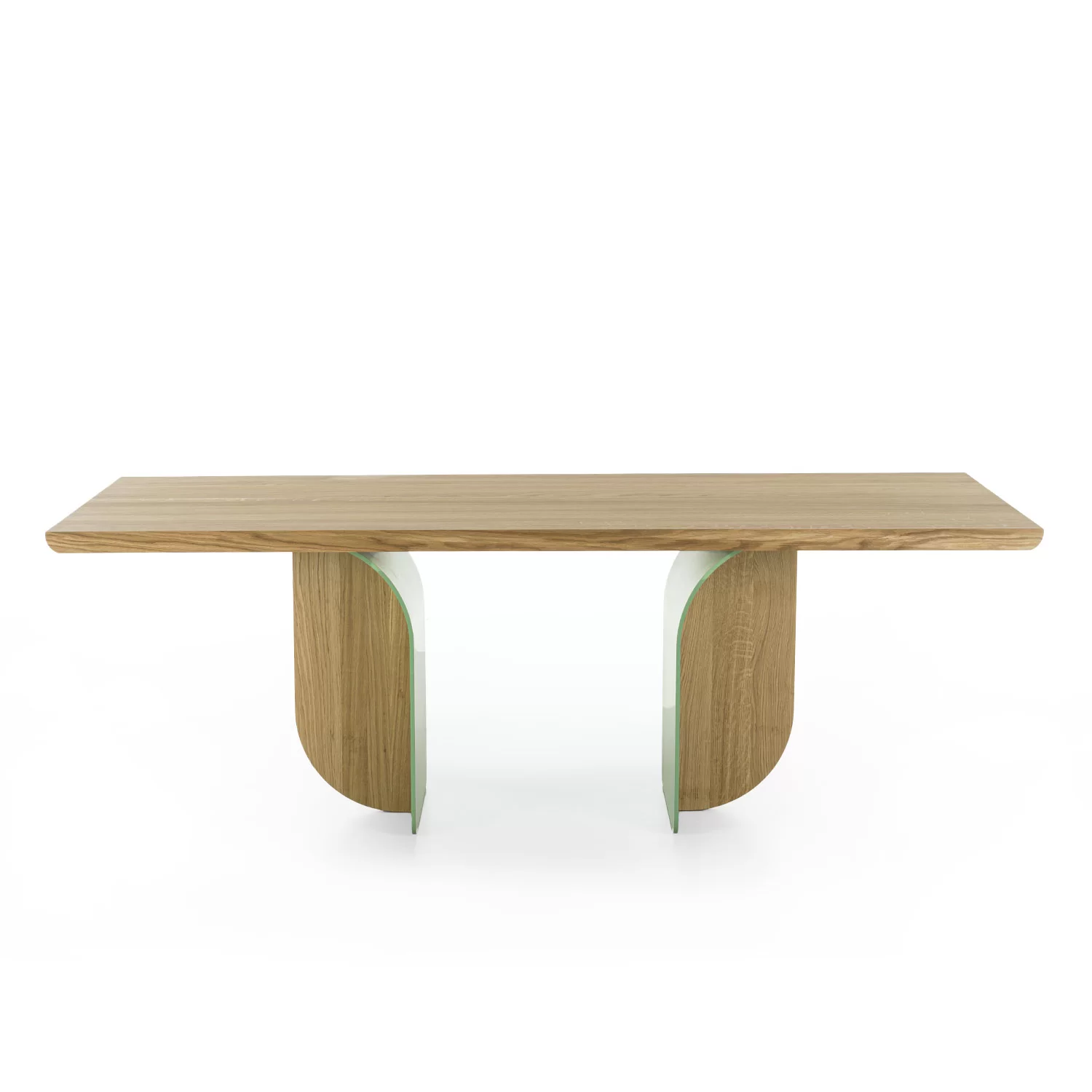 Tavolo con top in legno massello a liste incollate e bordi smussati, che si caratterizza per le gambe, nate dall’incontro tra ferro e legno e create per apparire diverse a seconda dell’angolazione da cui le si guarda.