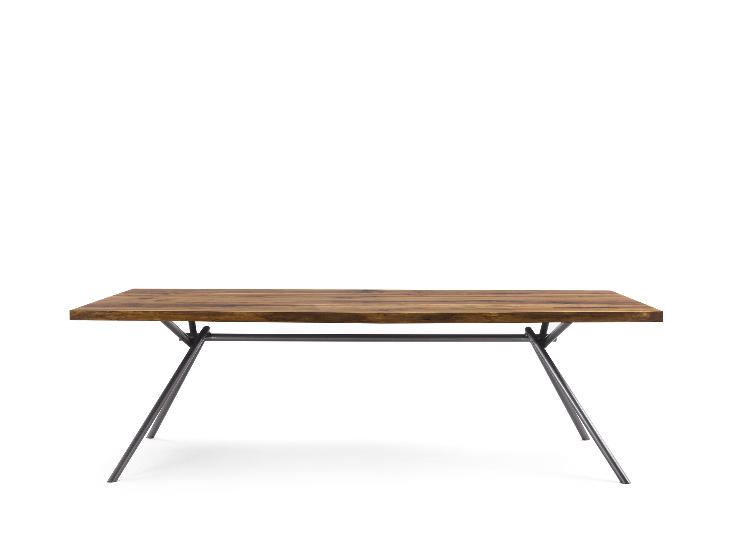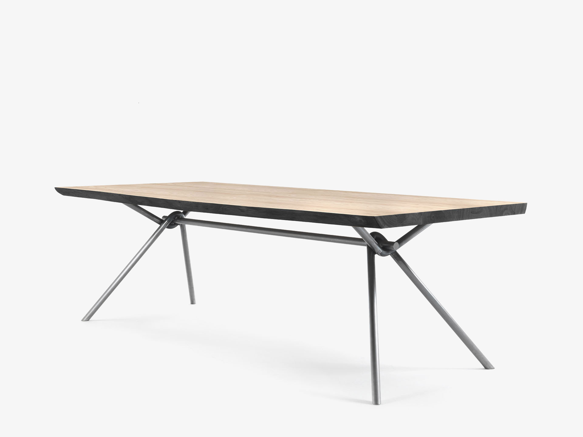 Tavolo composto da top in legno massello a liste incollate con bordi naturali o squadrati, abbinato ad una base essenziale e lineare formata da un tubolare intrecciato in ferro vuoto. Disponibile a richiesta in tubolare intrecciato in ferro pieno.
