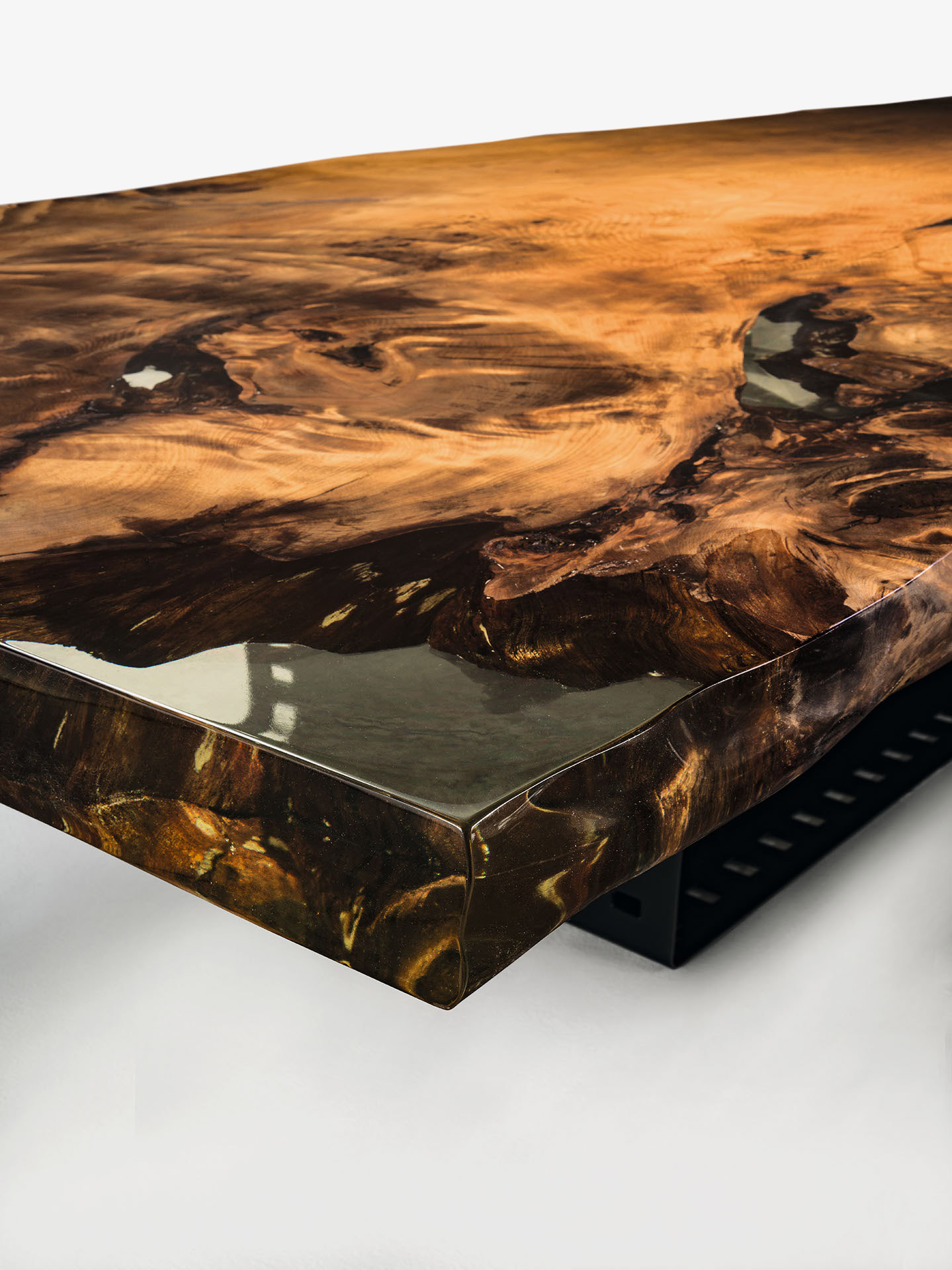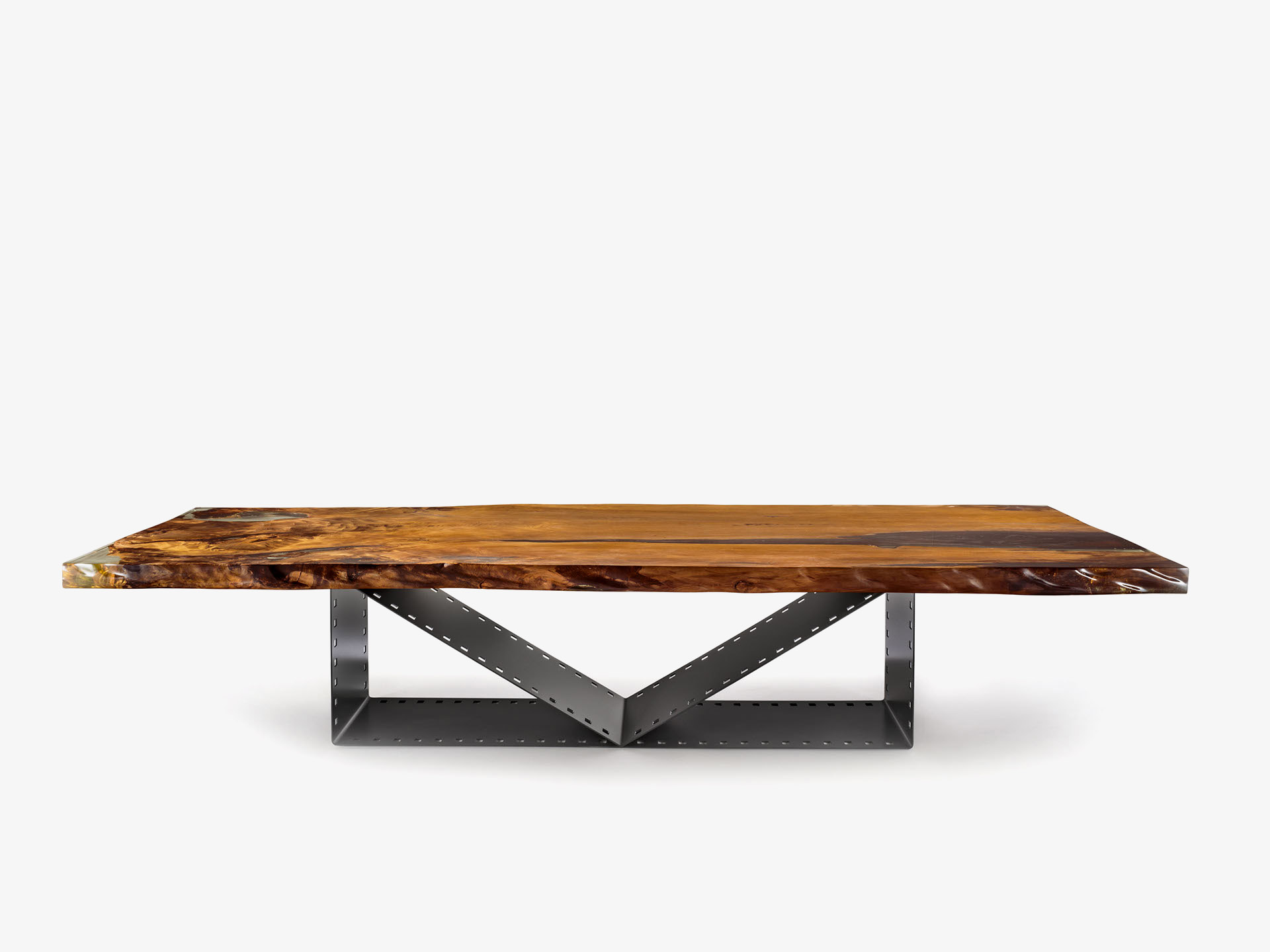 Tavolo realizzato con top in massello di Kauri e base geometrica in ferro calandrato il cui design si ispira alla pellicola cinematografica.