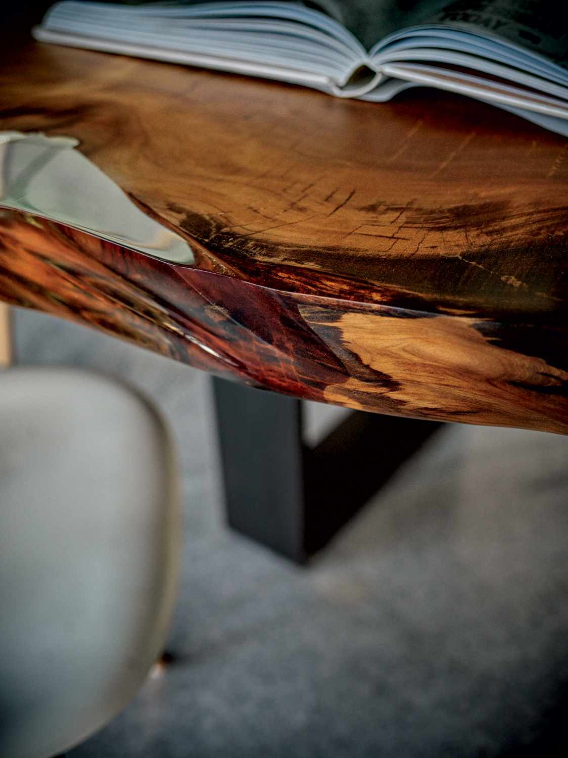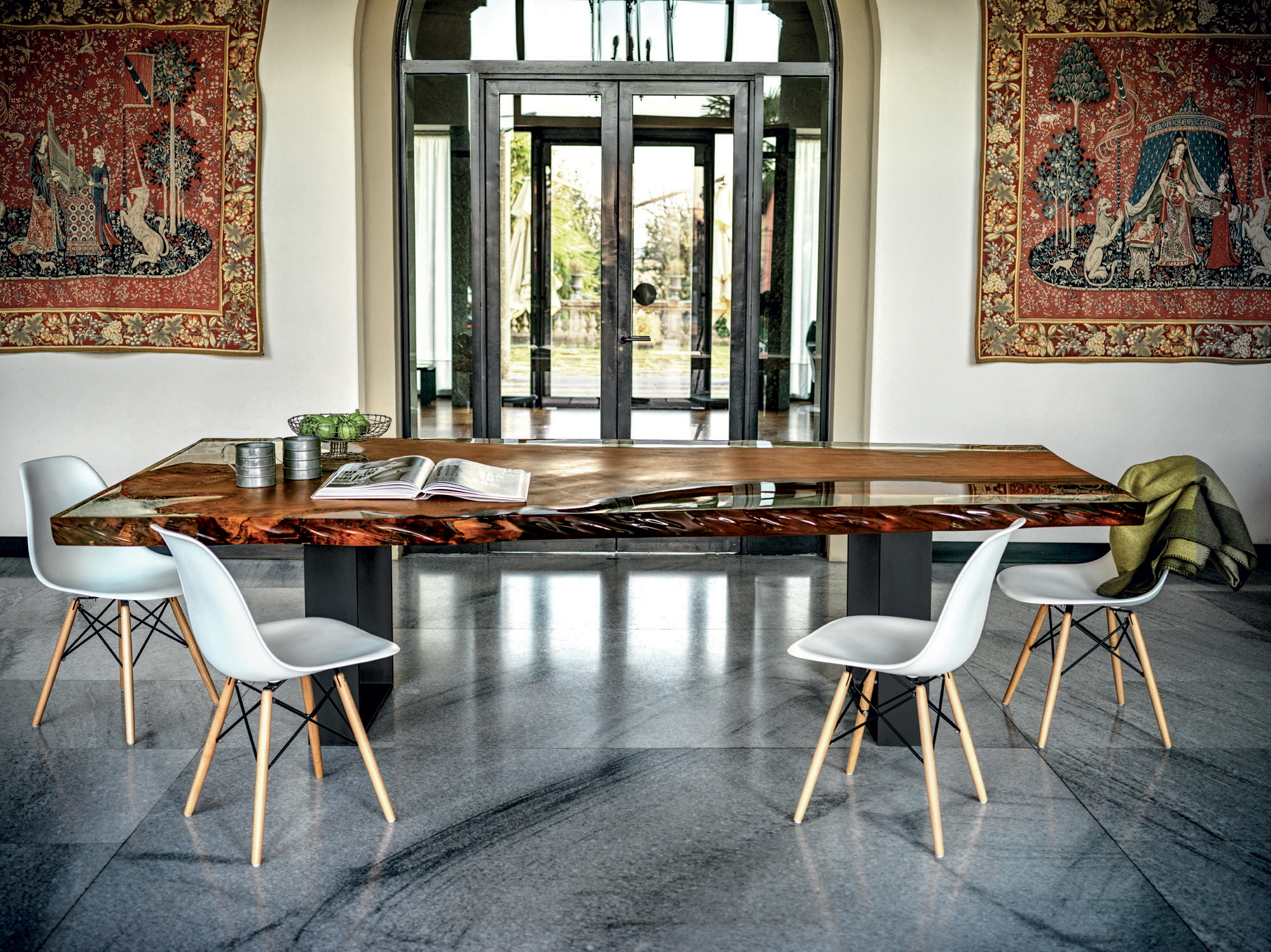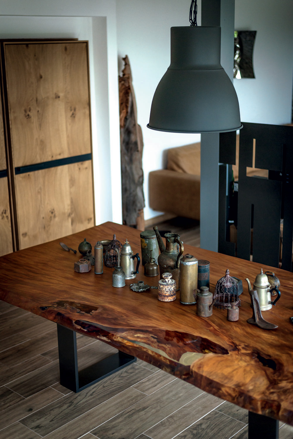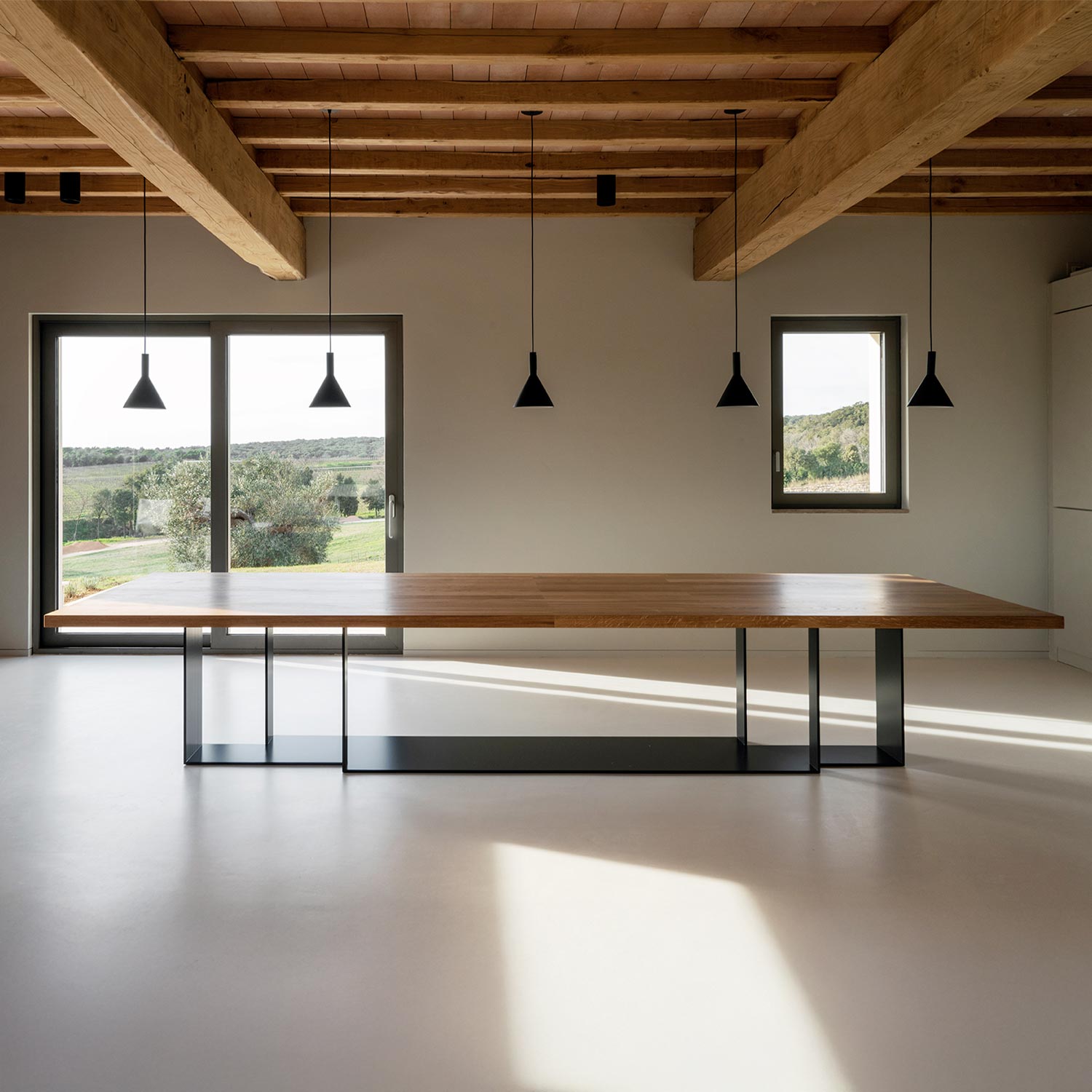Tavolo realizzato con top in massello di Kauri. La base si compone di gambe in ferro.