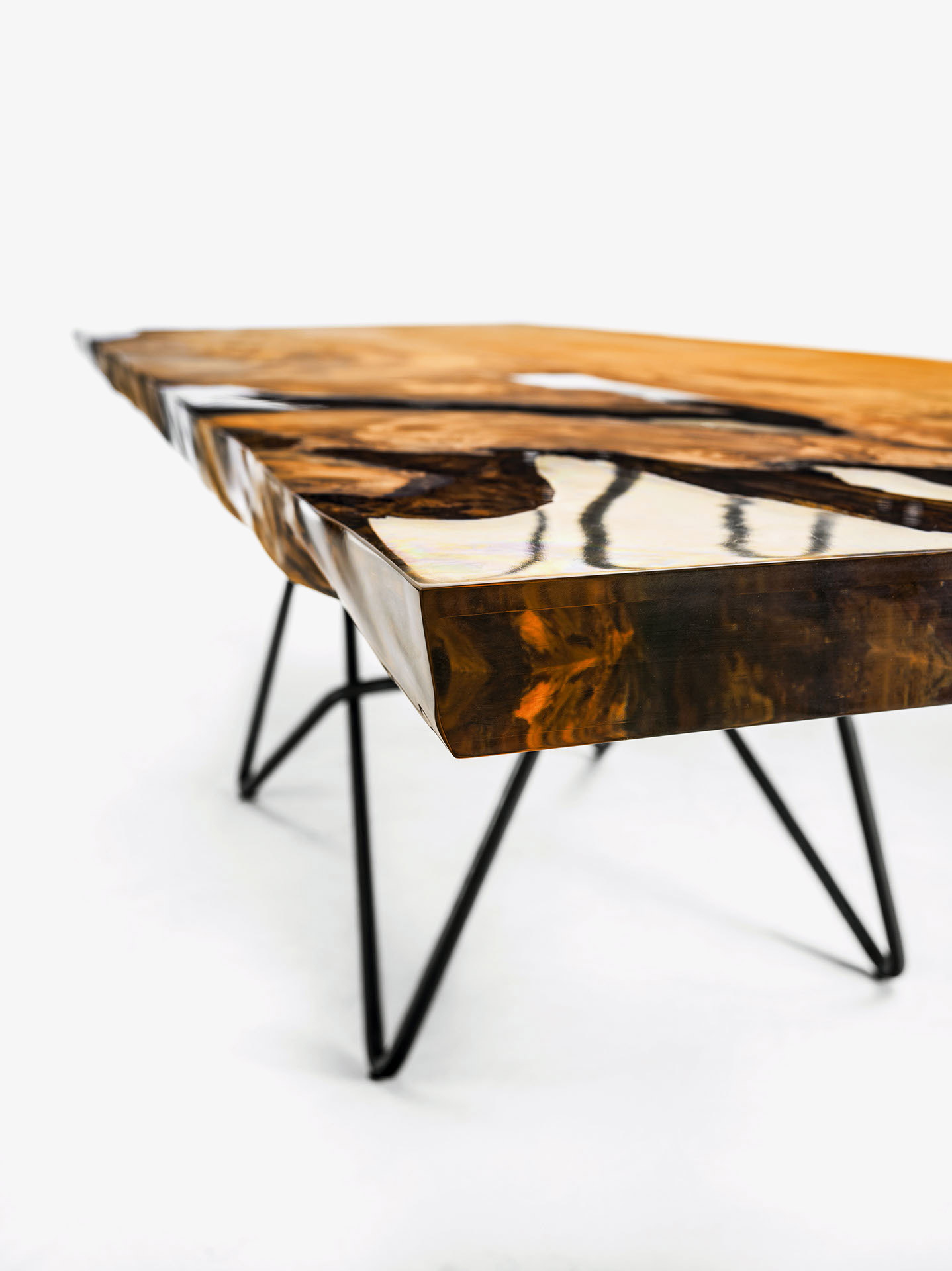 Tavolo realizzato con top in massello di Kauri, abbinato ad una base in ferro con sezione tubolare.