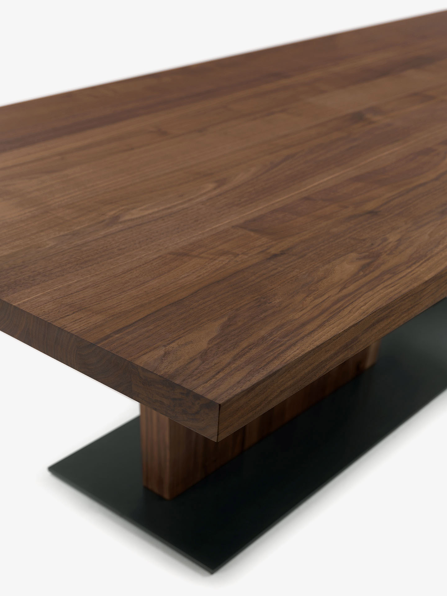 Tavolo interamente realizzato in legno massello a liste incollate e lati squadrati, in abbinata ad una gamba in legno asimmetrica, posizionata lateralmente, e piastra a pavimento in ferro.