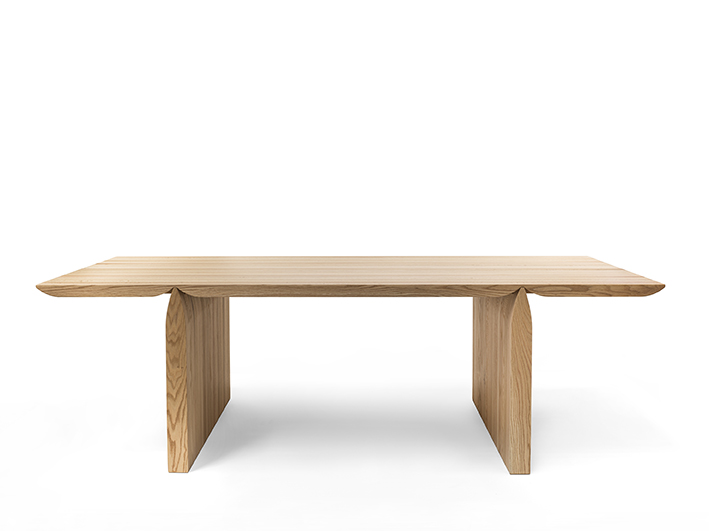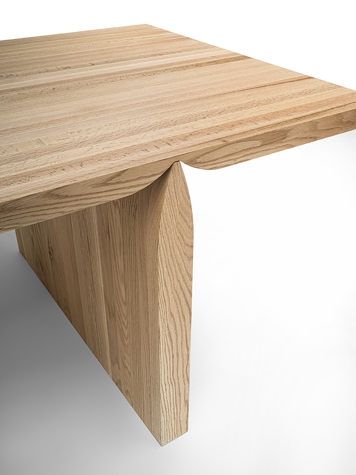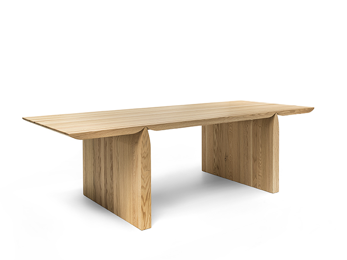 Tavolo interamente in legno massello con top a liste incollate, con due lati squadrati, la cui forma si ispira al mondo della natura e, nello specifico, alla forma di una libellula.
