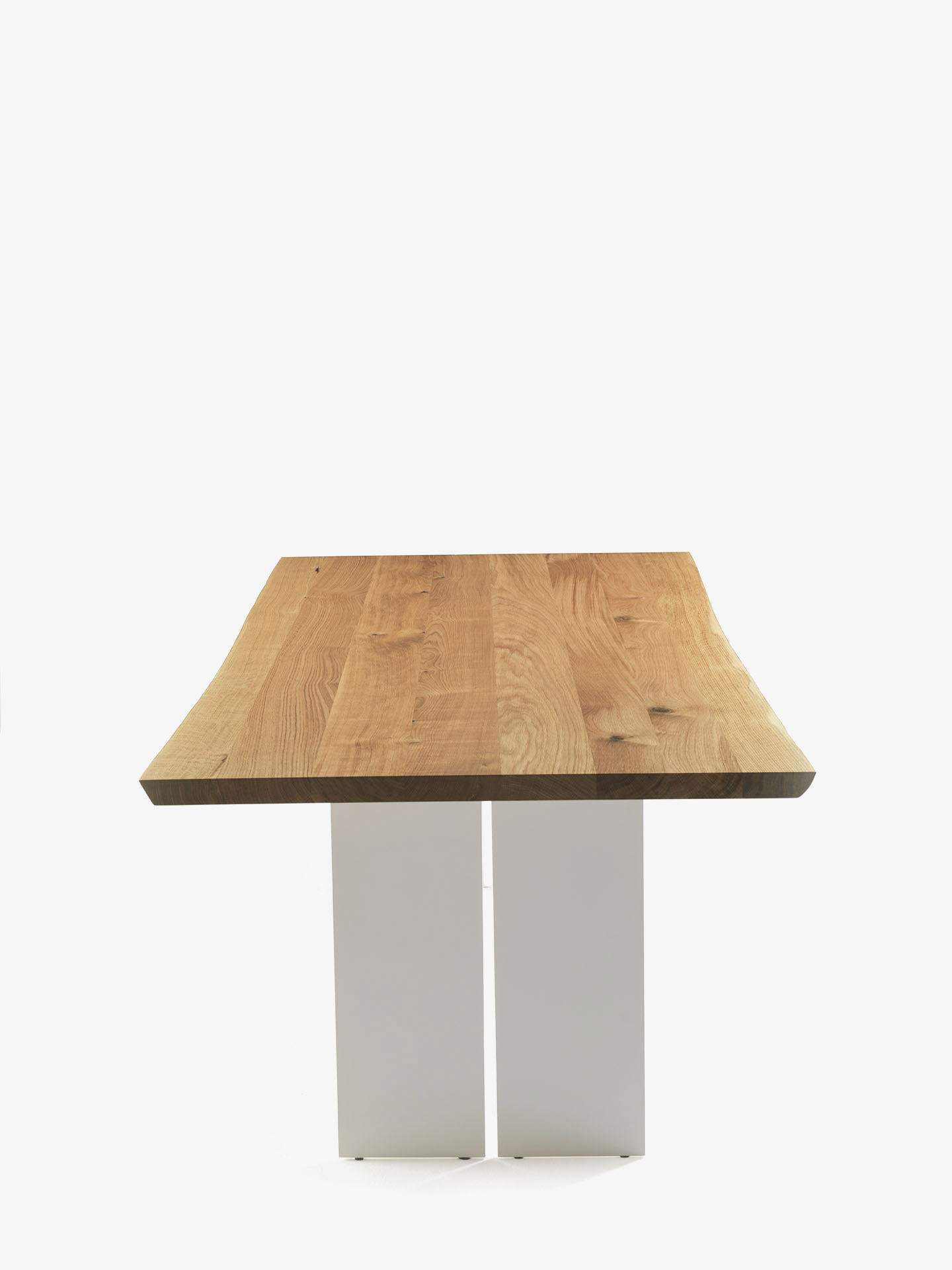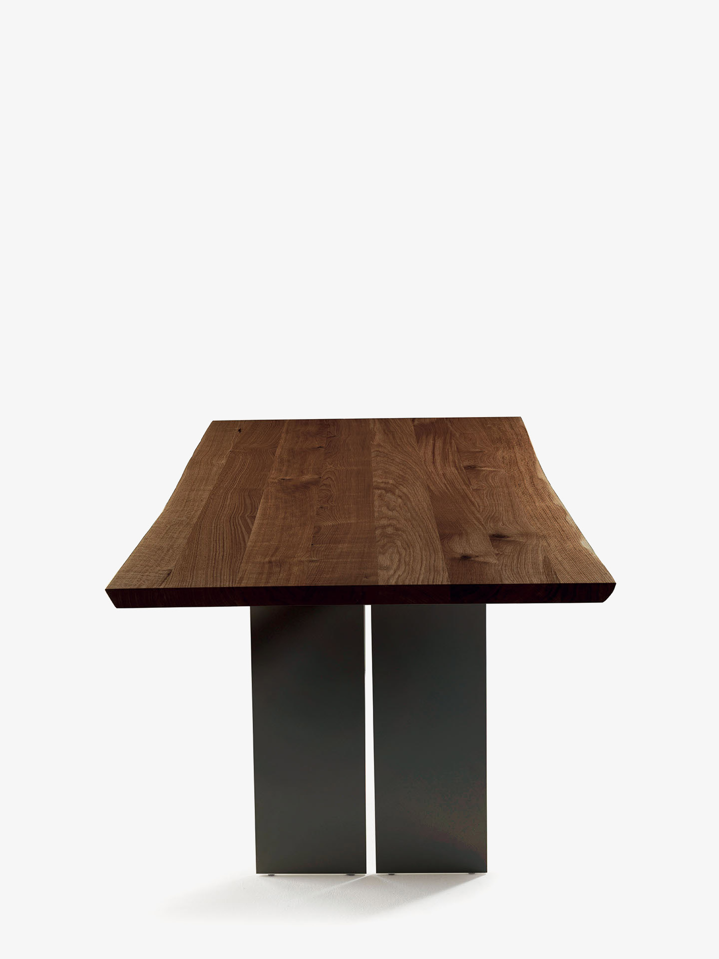 Tavolo con top in legno massello a liste incollate con bordi naturali, in abbinata a gambe in ferro dotate di fuga centrale.