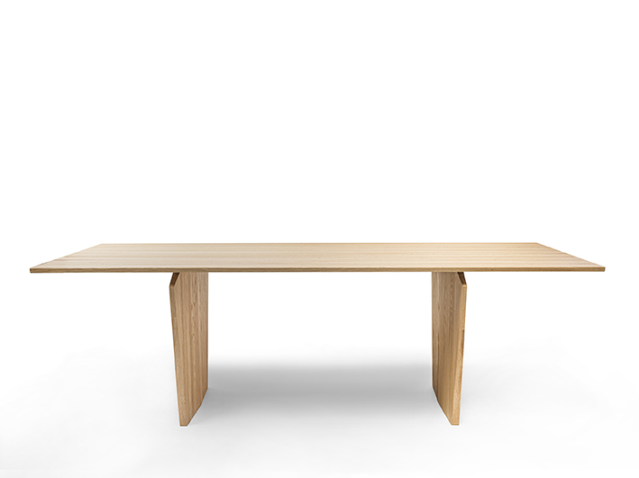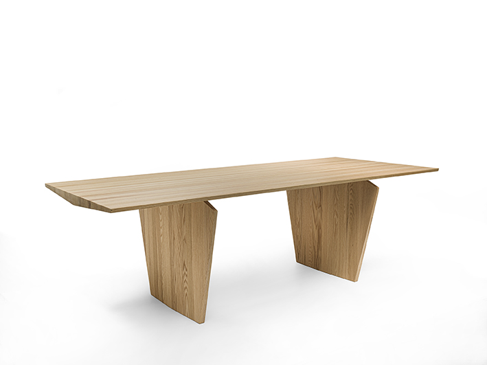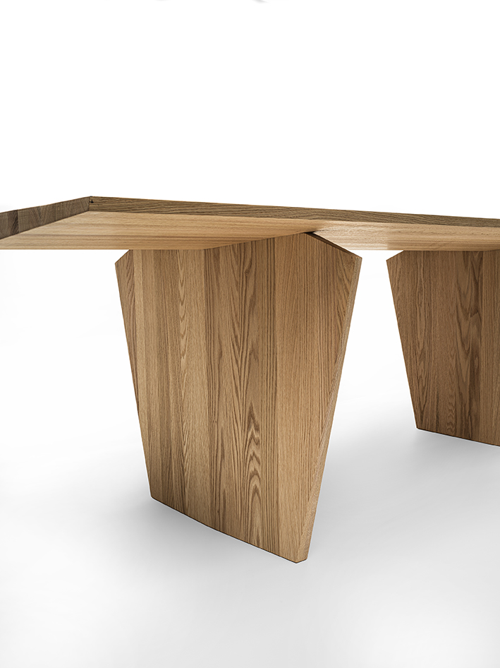 Tavolo interamente in legno massello con top a liste incollate e bordi assottigliati. La forma ricorda una lavorazione per “via di levare”, come se blocchi di legno venissero scolpiti e rifiniti fino a ottenere la forma finale.