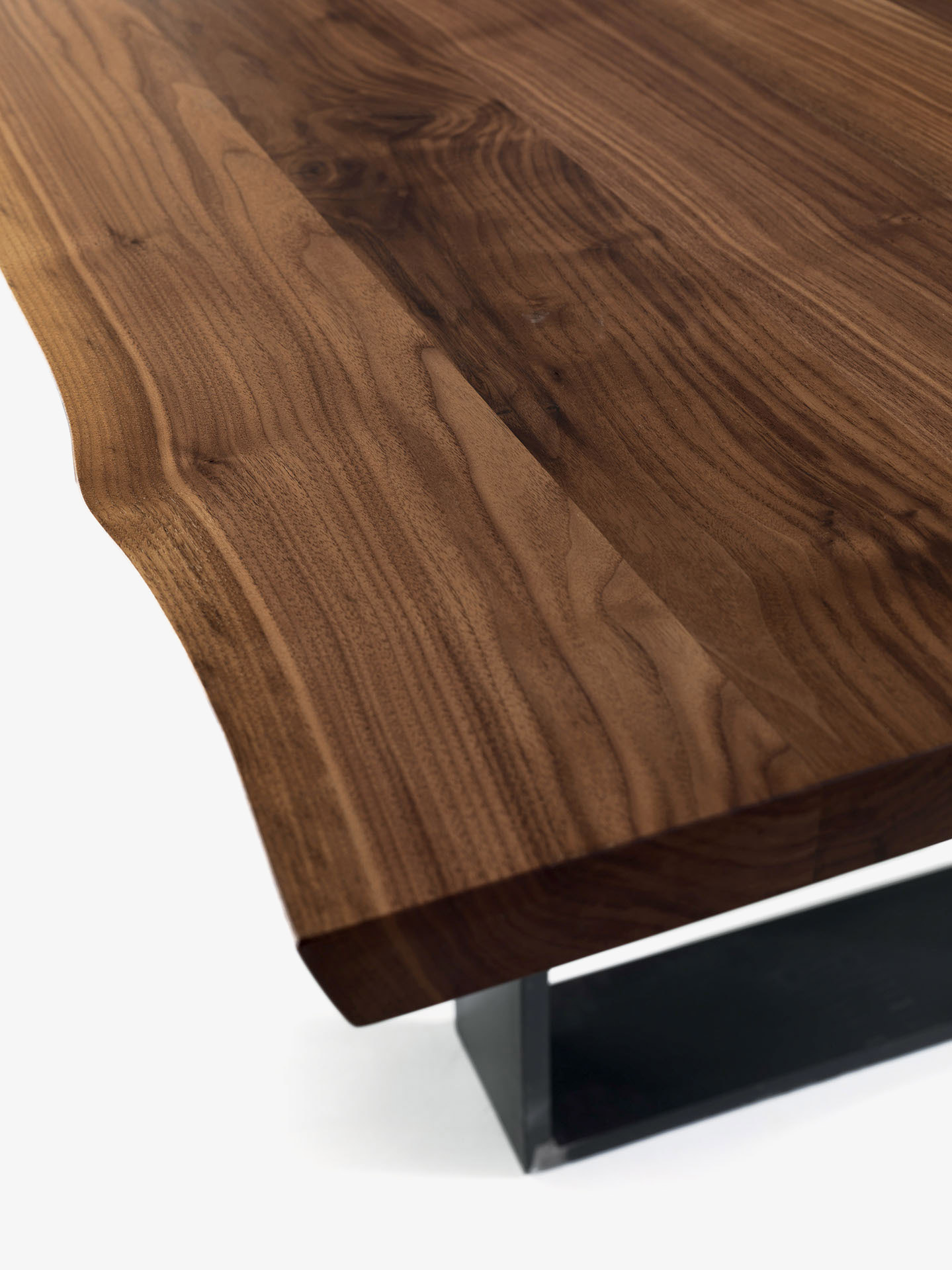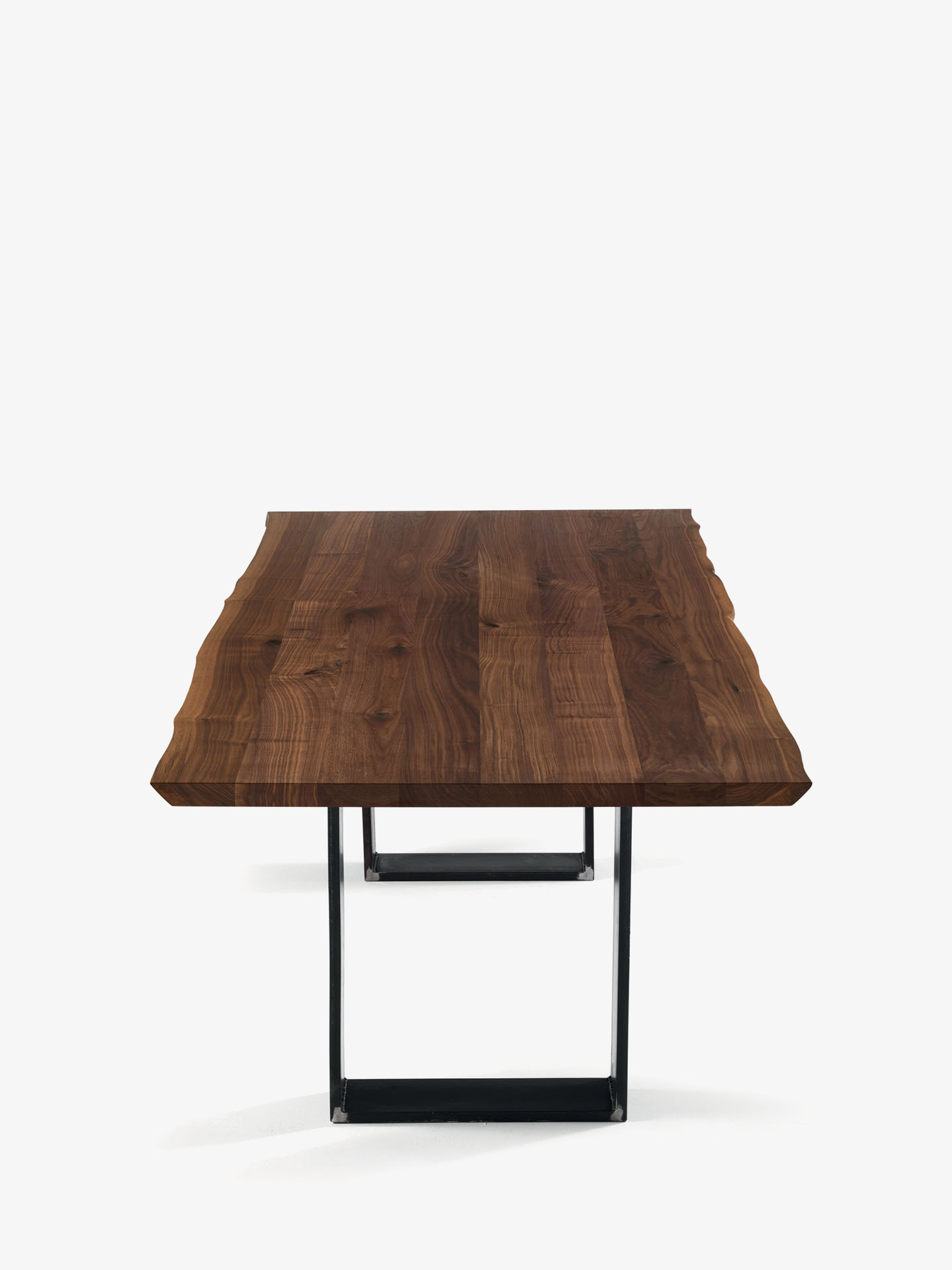 Tavolo con top in legno massello a liste incollate con bordi naturali, in abbinata a gambe in ferro.