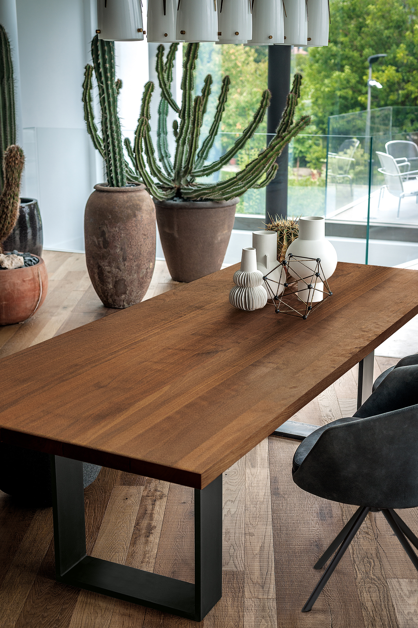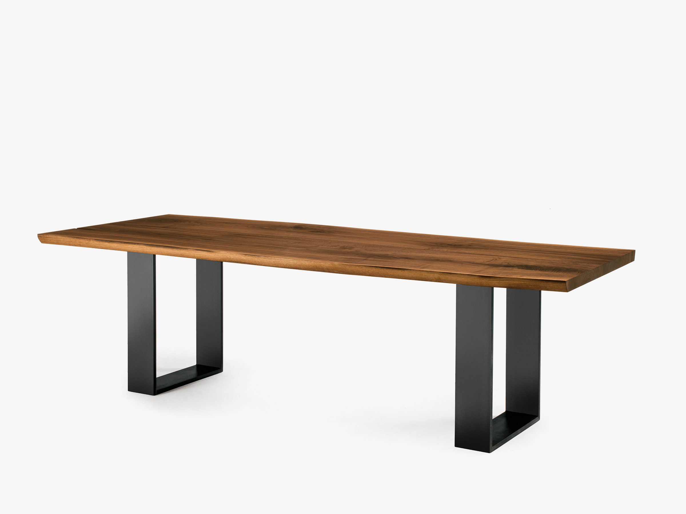 Tavolo con top in legno massello a liste incollate con bordi squadrati, in abbinata a gambe in ferro.