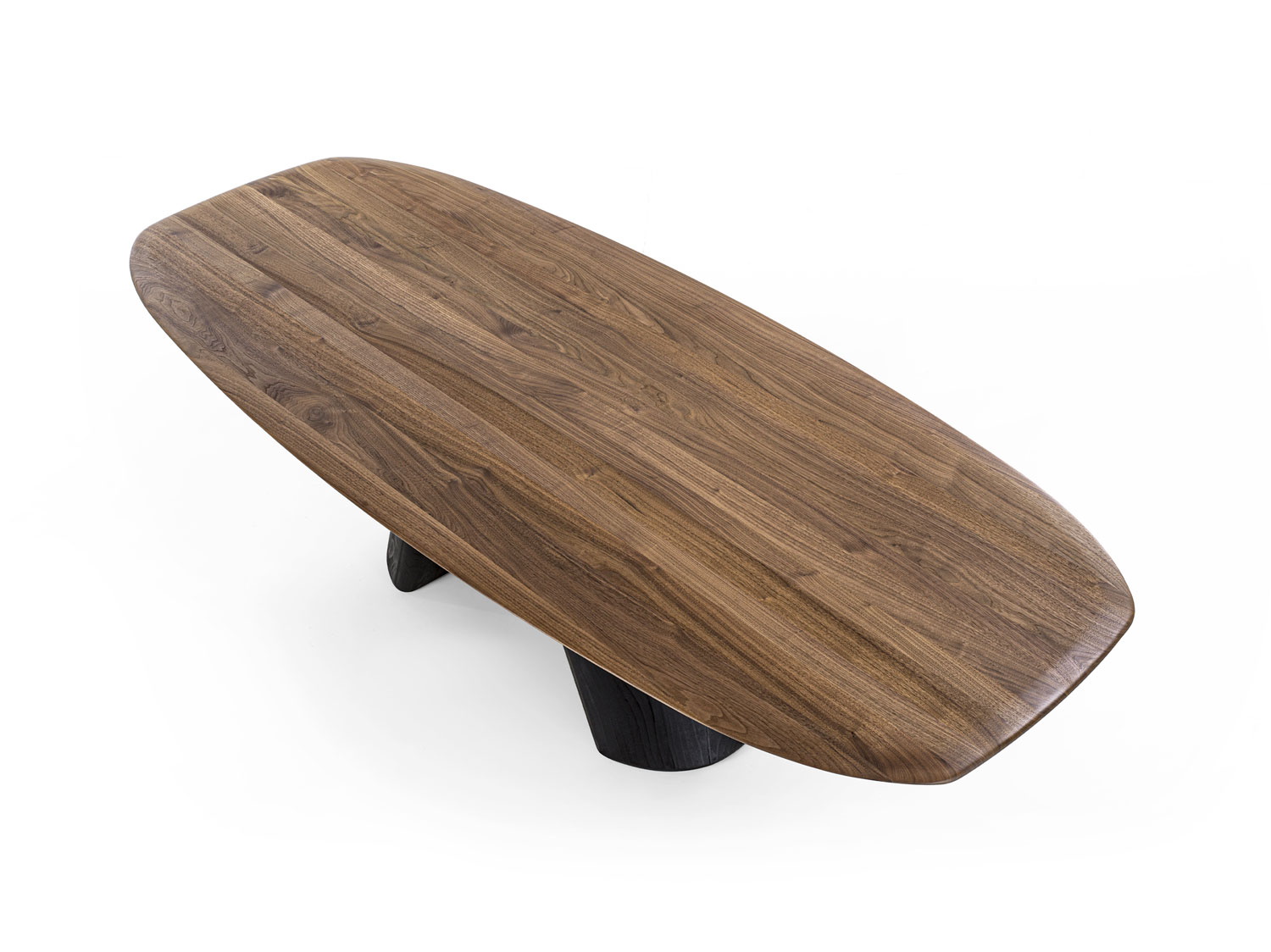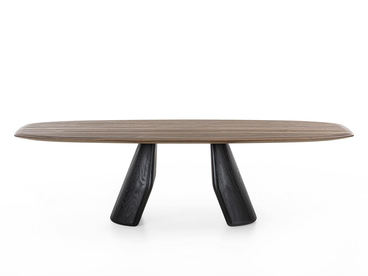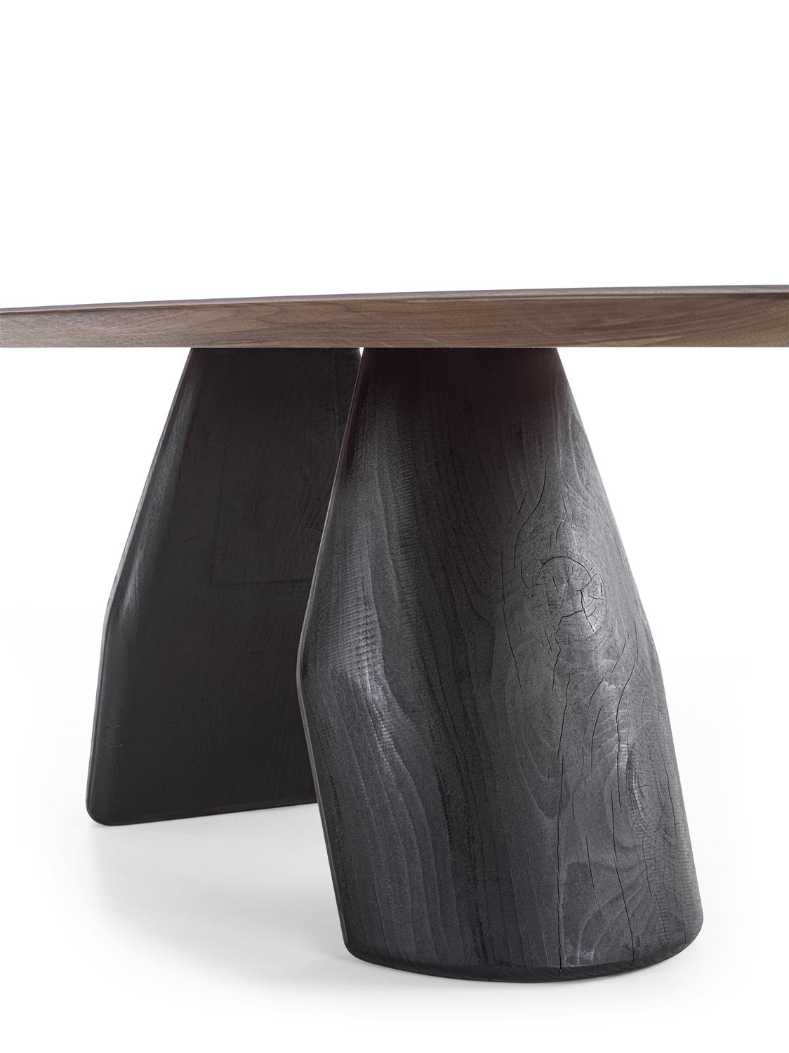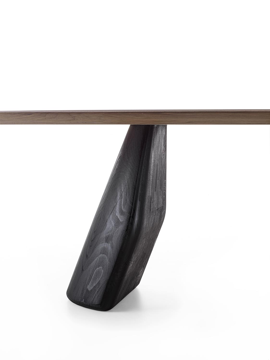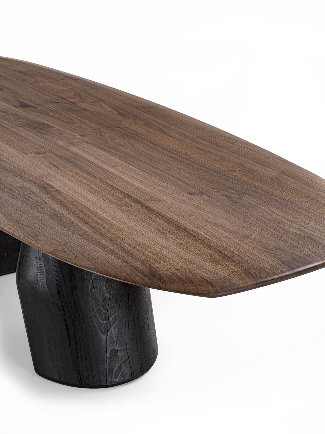 Tavolo con top in legno massello a liste incollate con bordi smussati. Le gambe, dalla forma scultorea, sono concepite come un equilibrio tra due volumi che, pur opponendosi visivamente in modo inaspettato, mantengono una perfetta stabilità.