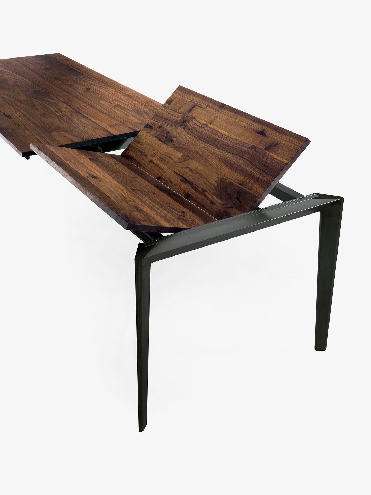 Tavolo allungabile con top realizzato in legno massello a liste incollate con lati squadrati e base in ferro. La versione allungabile si distingue per un innovativo e tecnologico sistema, con binari in alluminio perfettamente integrati nella struttura a garantire una prolunga di 100 cm.