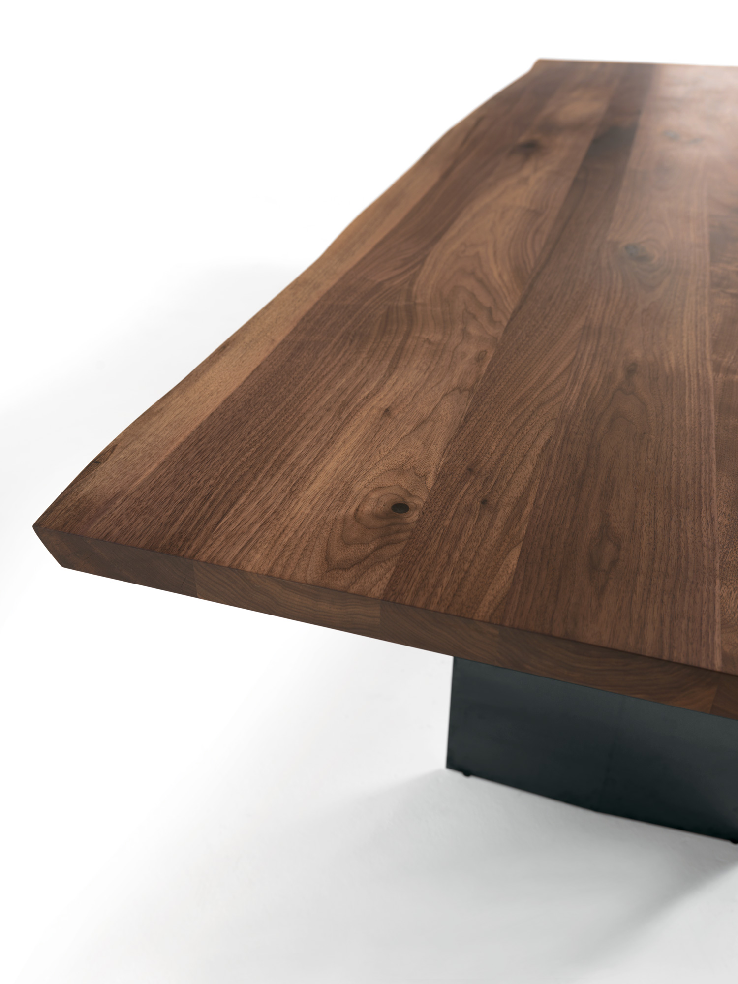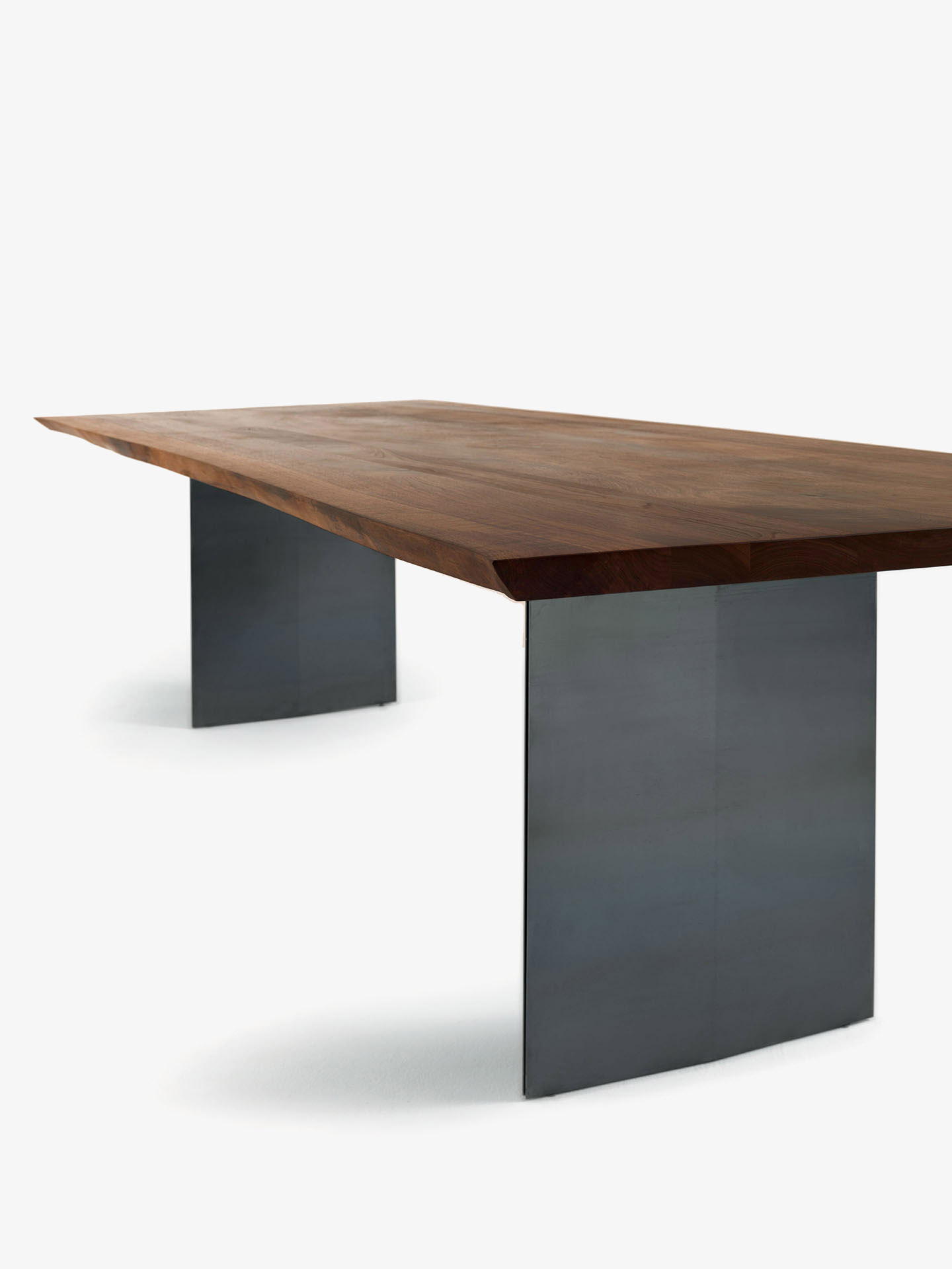 Tavolo con top in legno massello a liste incollate con bordi naturali, in abbinata a gambe in ferro caratterizzate da una doppia lamina semi-piegata dalla forma a rombo.