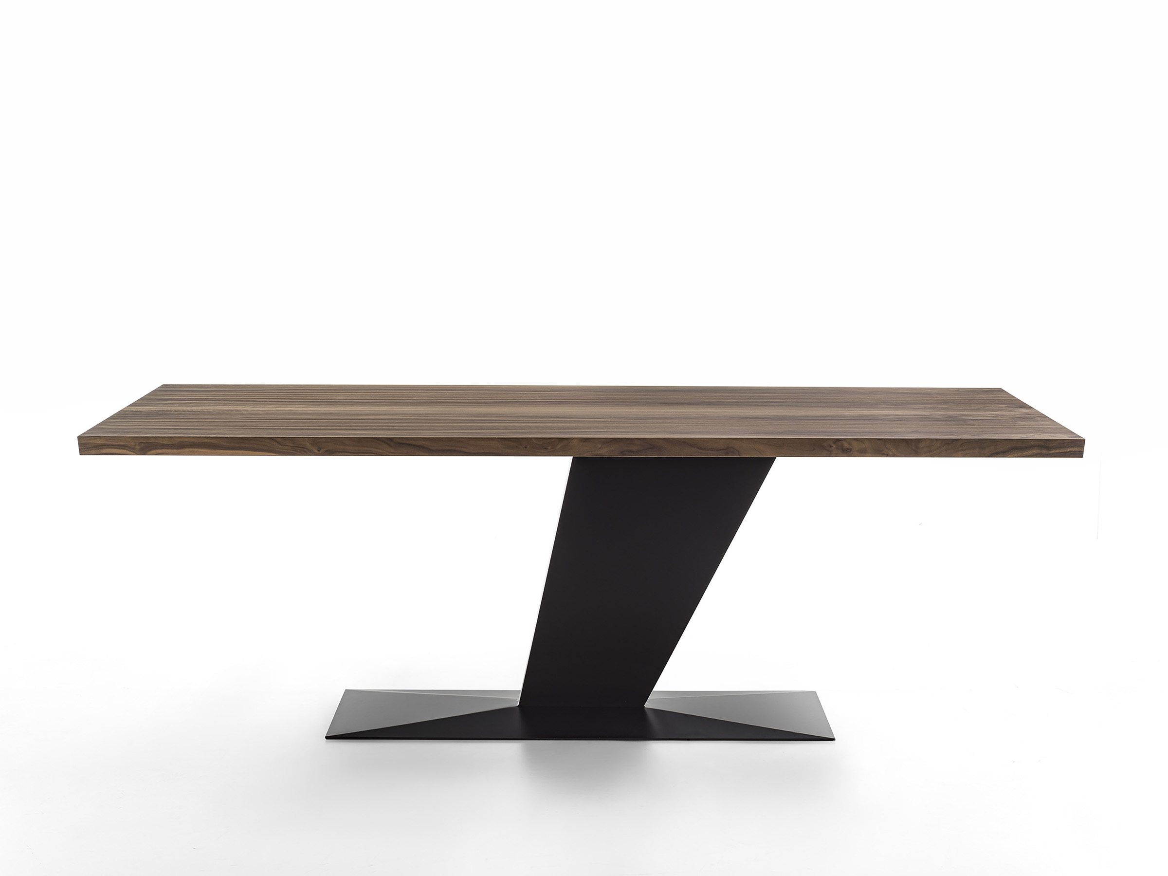 Tavolo con top in legno massello a liste incollate e bordi smussati, in abbinata ad una base in ferro costituita da gamba decentrata ed inclinata, posizionata lateralmente, e piastra a pavimento.