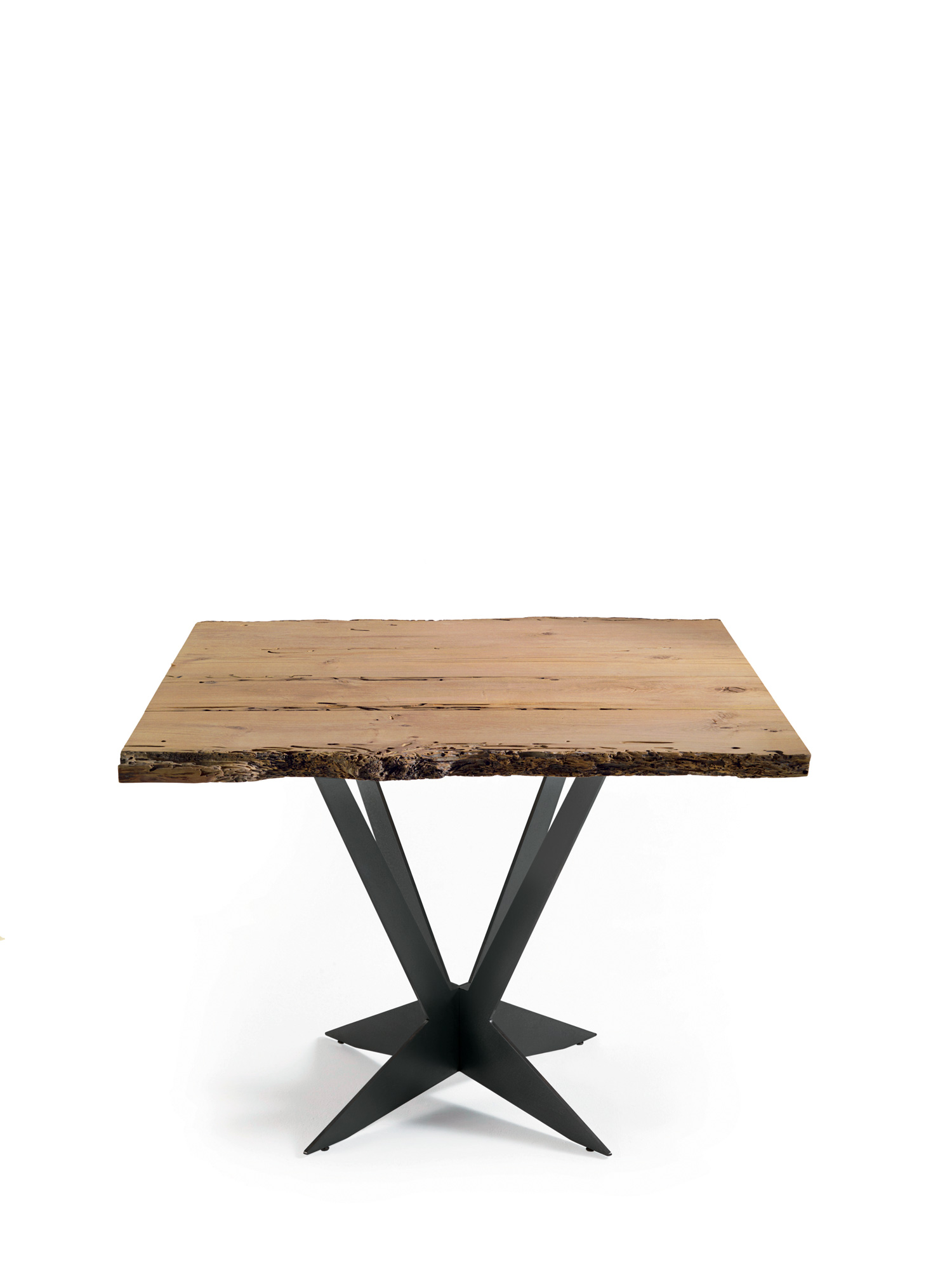 Tavolo quadrato realizzato in legno massello di Briccola, con top a liste accostate e due bordi naturali, dotato di gamba centrale in ferro con basamento a stella.