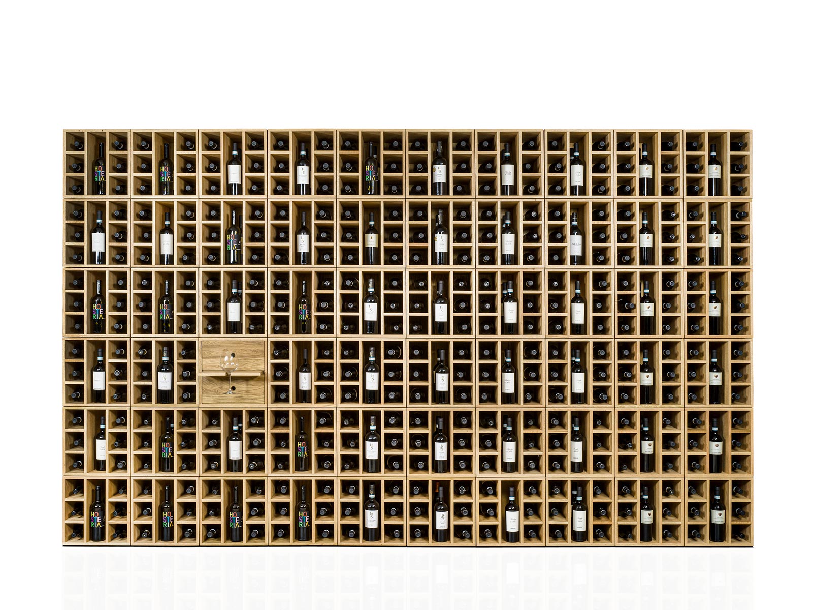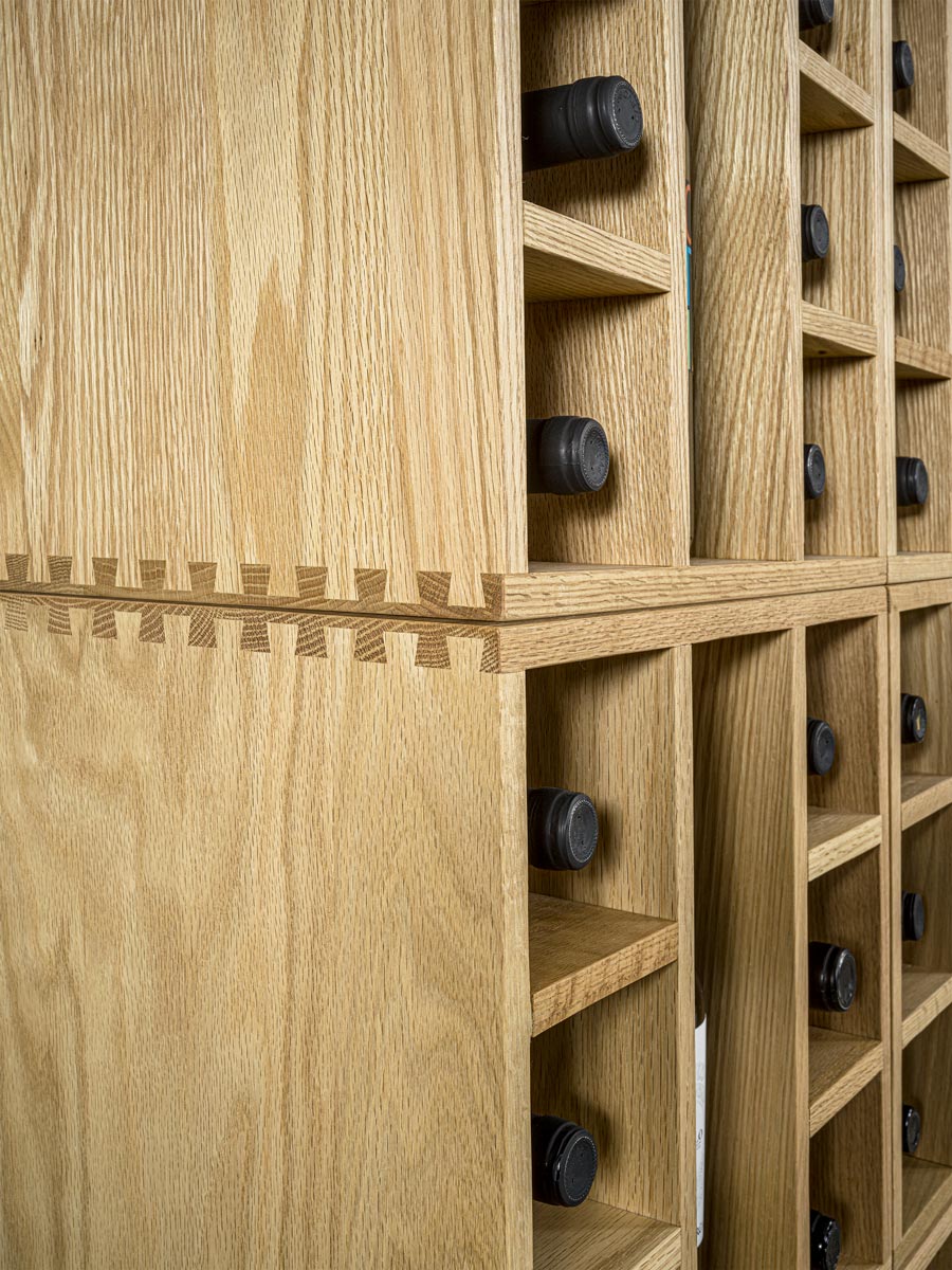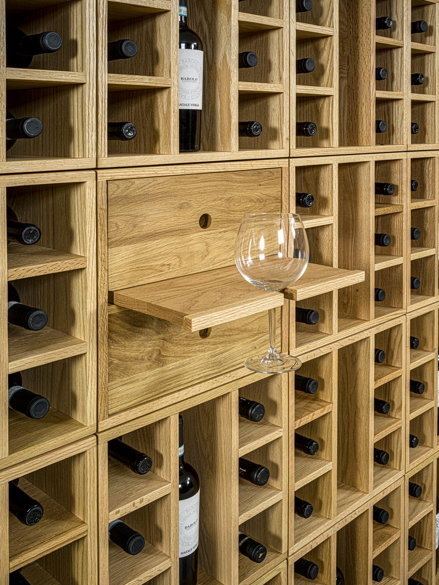 Mobile contenitore componibile in legno massello, ideale per l’esposizione di bottiglie. È costituito da moduli a giorno con griglia portabottiglie e da moduli con due cassetti e ripiano estraibile con portabicchieri, liberamente impilabili e accostabili tra loro grazie a una specifica ferramenta di montaggio. Ogni elemento è caratterizzato da incastri a coda di rondine.