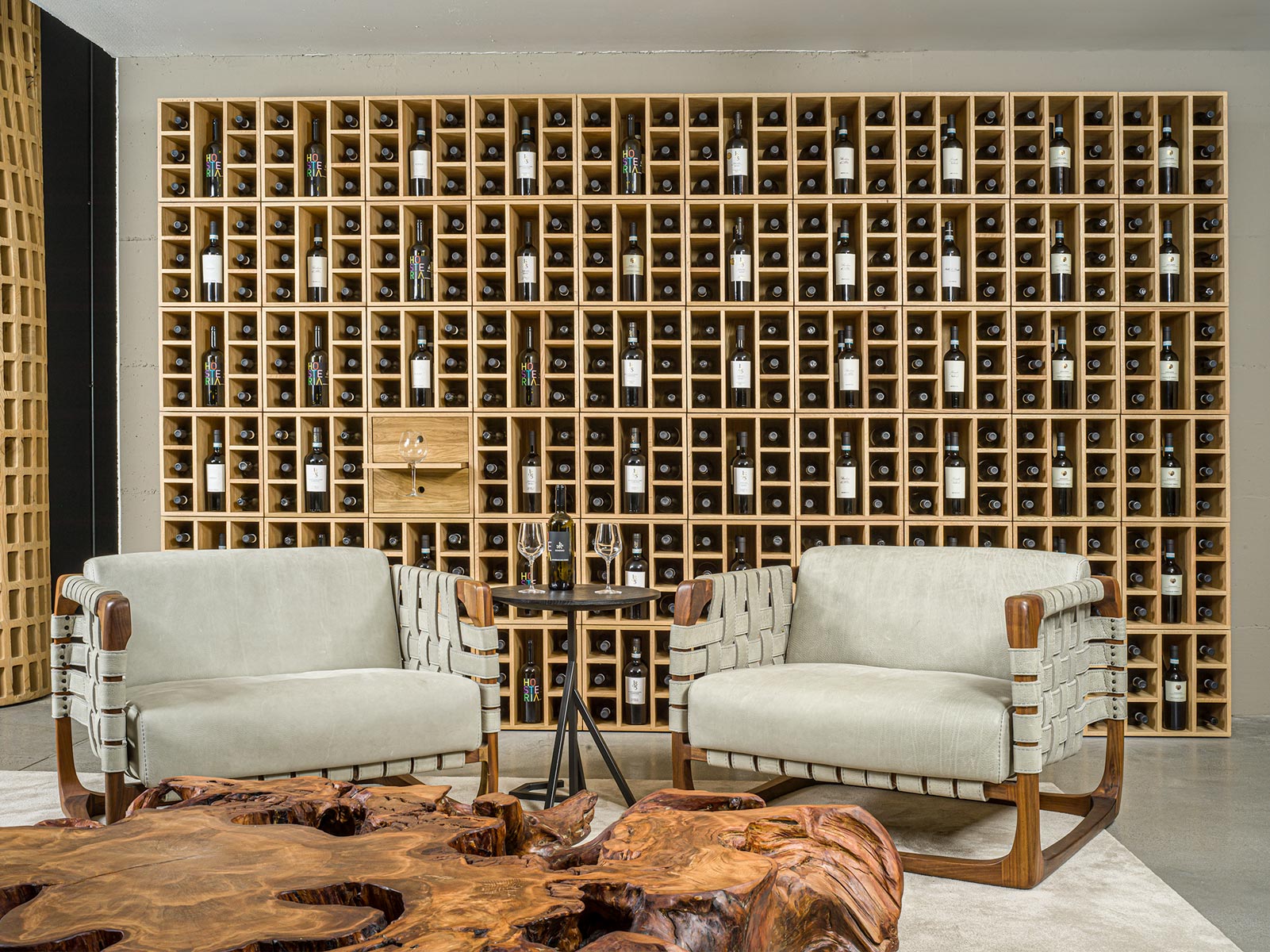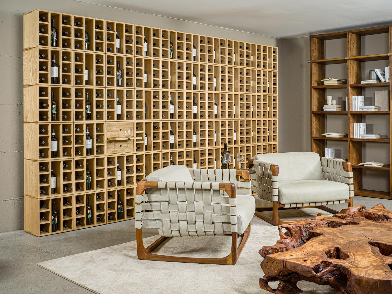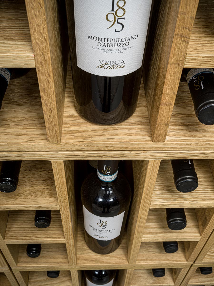 Mobile contenitore componibile in legno massello, ideale per l’esposizione di bottiglie. È costituito da moduli a giorno con griglia portabottiglie e da moduli con due cassetti e ripiano estraibile con portabicchieri, liberamente impilabili e accostabili tra loro grazie a una specifica ferramenta di montaggio. Ogni elemento è caratterizzato da incastri a coda di rondine.