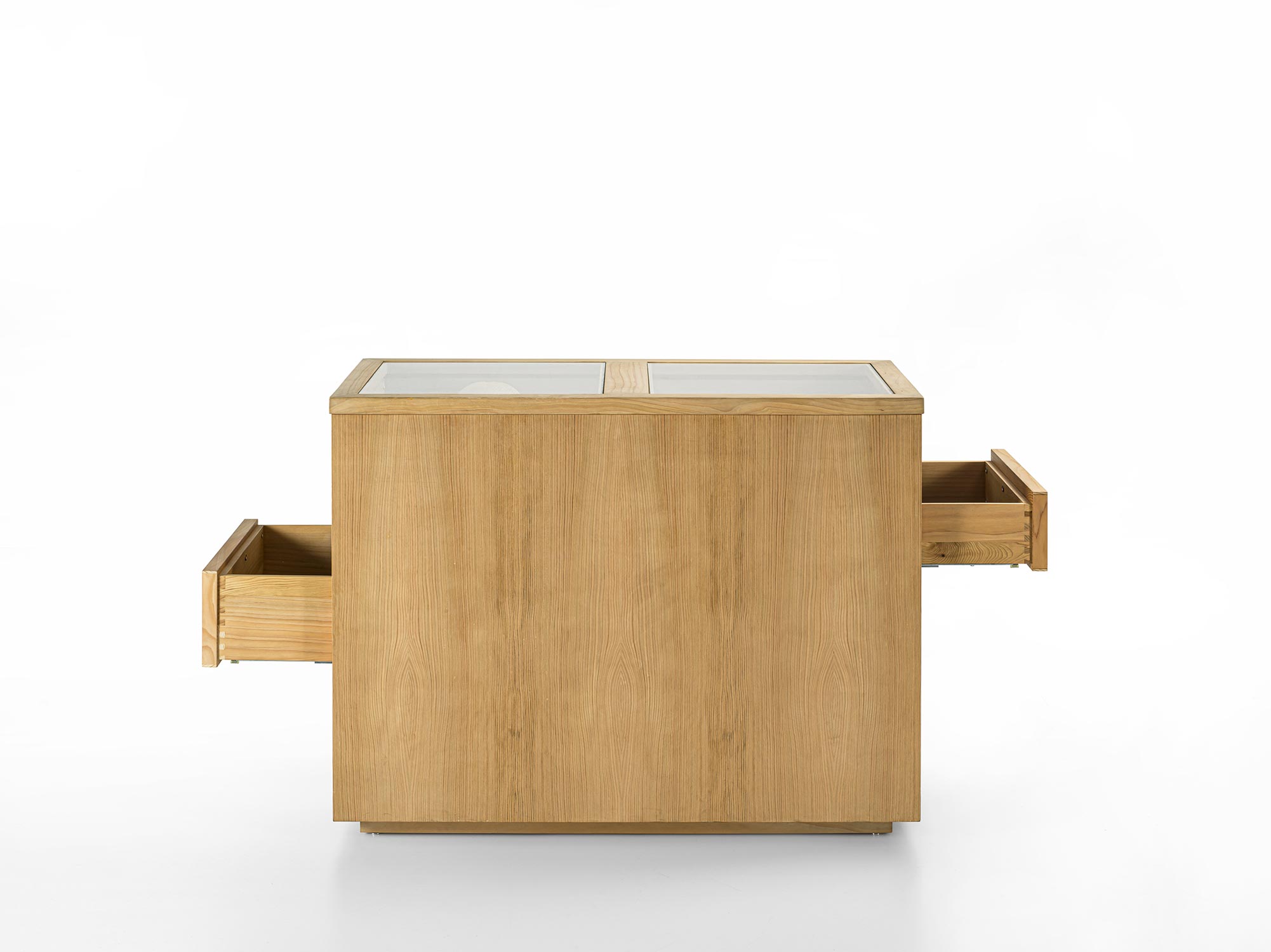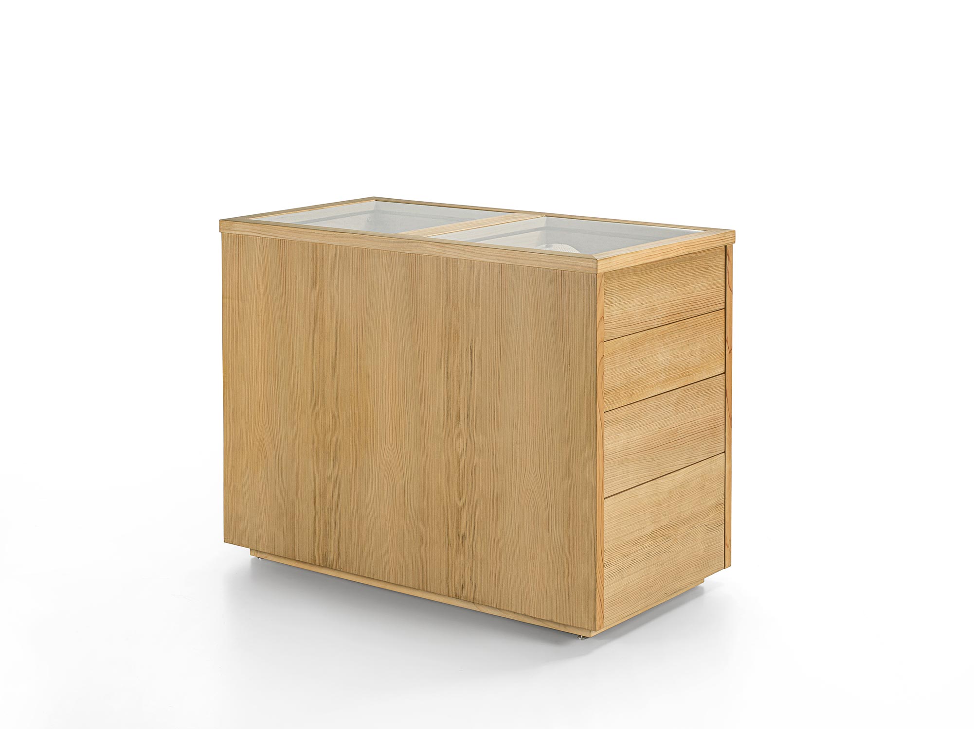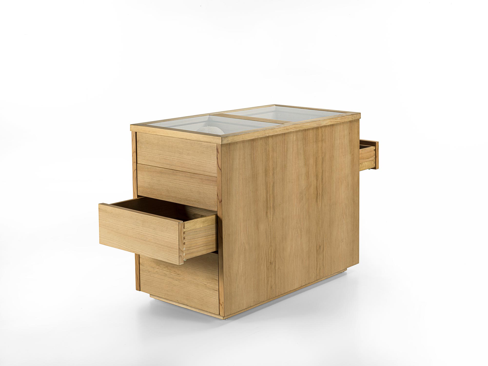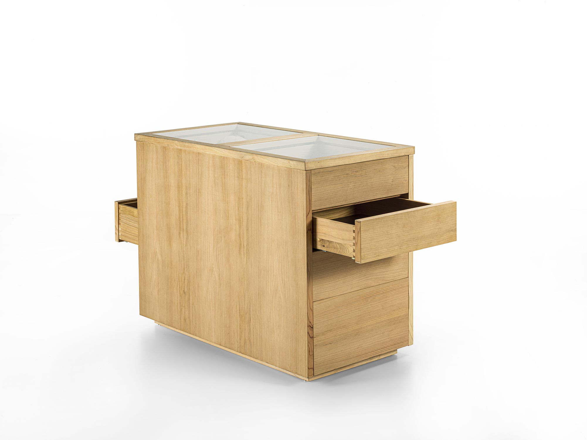 Il Sistema di armadi Avant si completa con elemento contenitore centro stanza. Organizzato con 4 cassetti disposti su entrambi i lati e con tradizionale incastro a coda di rondine. Ideale per organizzare al meglio gli accessori per lui e per lei, ognuno con il proprio spazio. Realizzato in legno listellare e massello e parte superiore con piano in vetro.