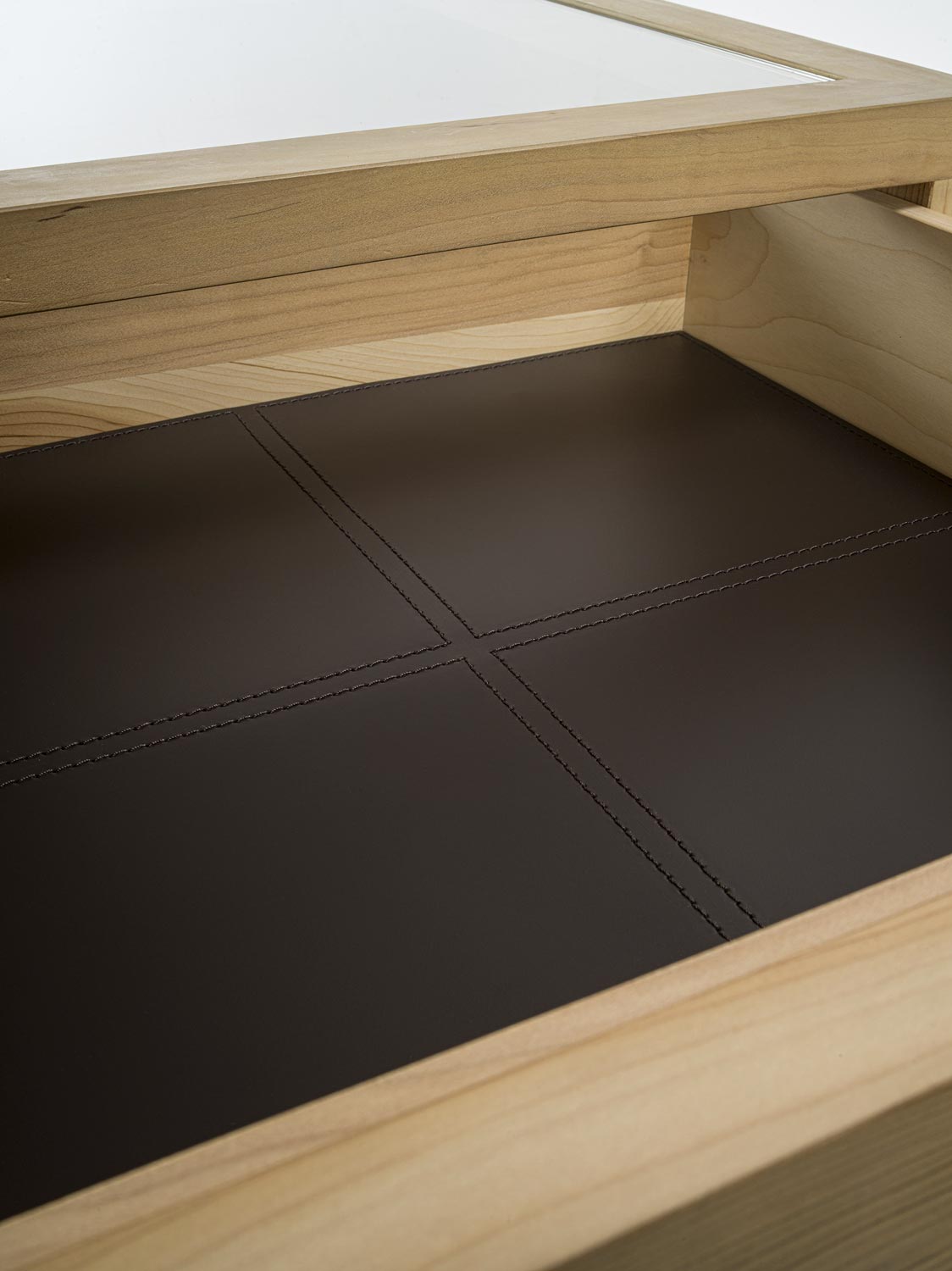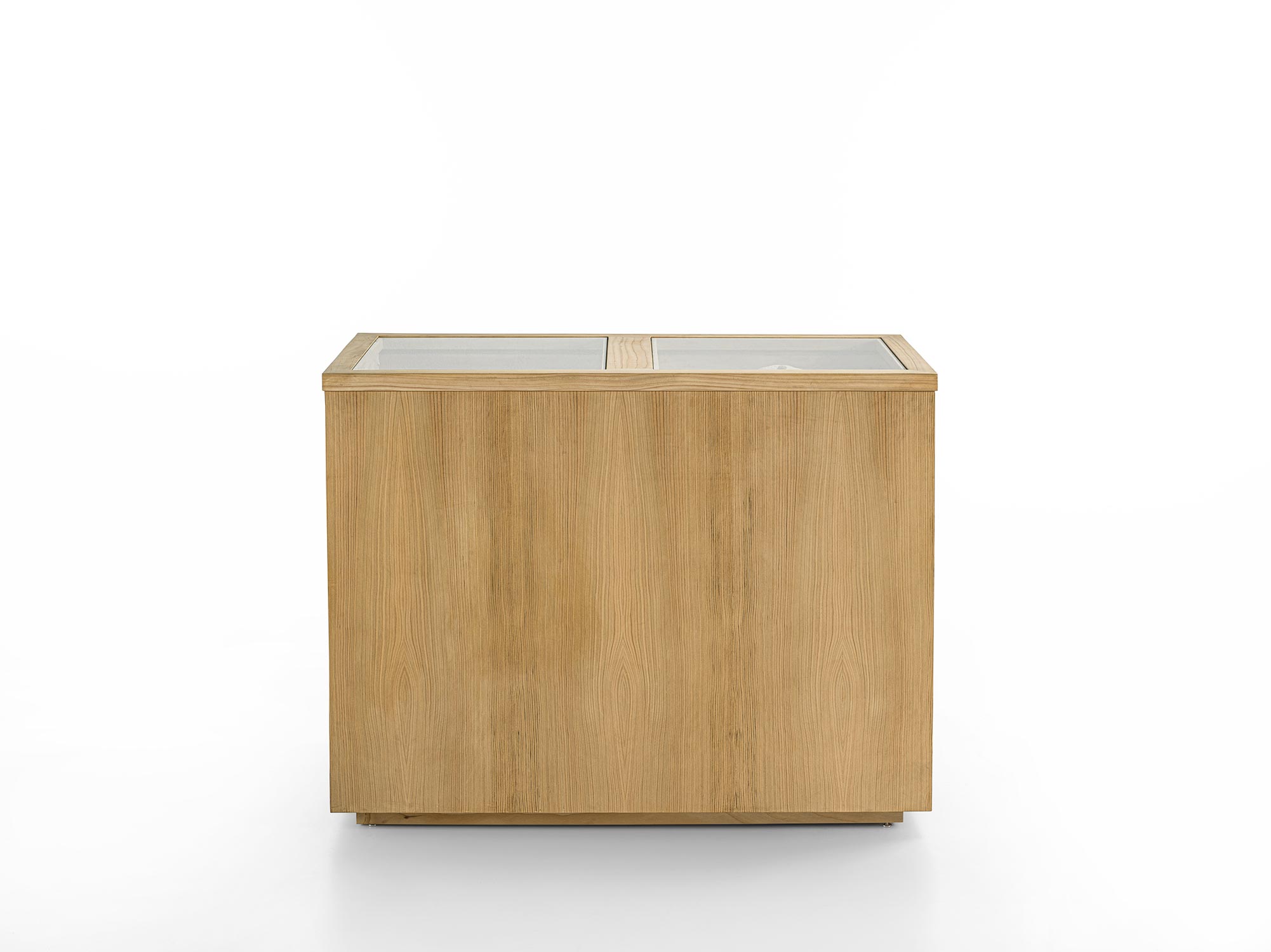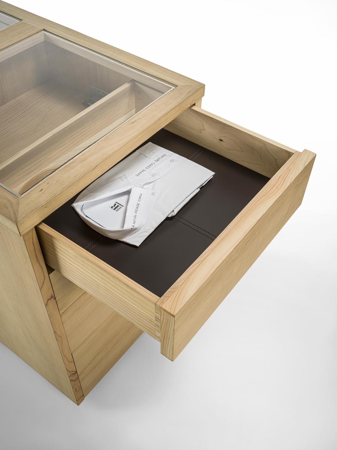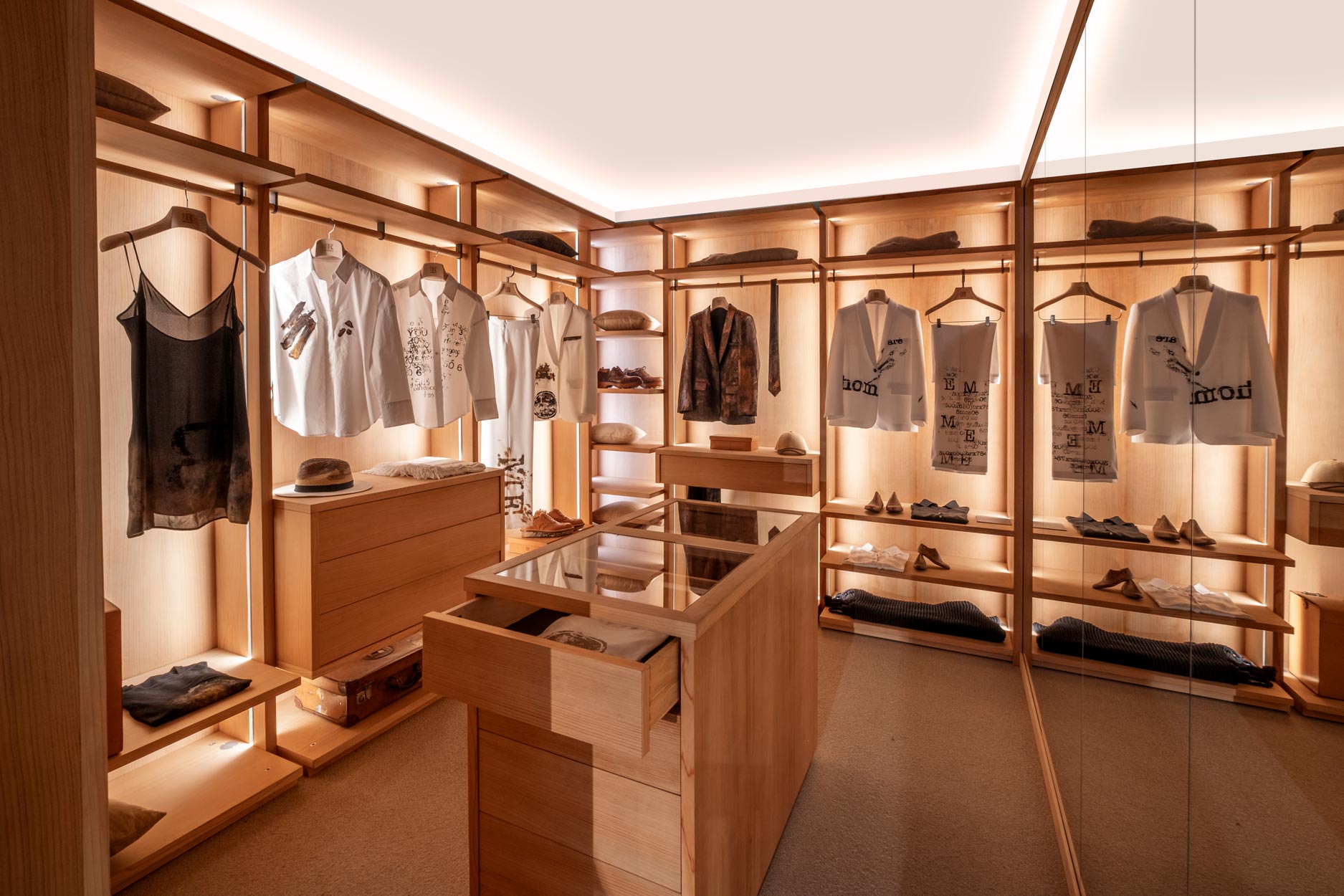 Il Sistema di armadi Avant si completa con elemento contenitore centro stanza. Organizzato con 4 cassetti disposti su entrambi i lati e con tradizionale incastro a coda di rondine. Ideale per organizzare al meglio gli accessori per lui e per lei, ognuno con il proprio spazio. Realizzato in legno listellare e massello e parte superiore con piano in vetro.