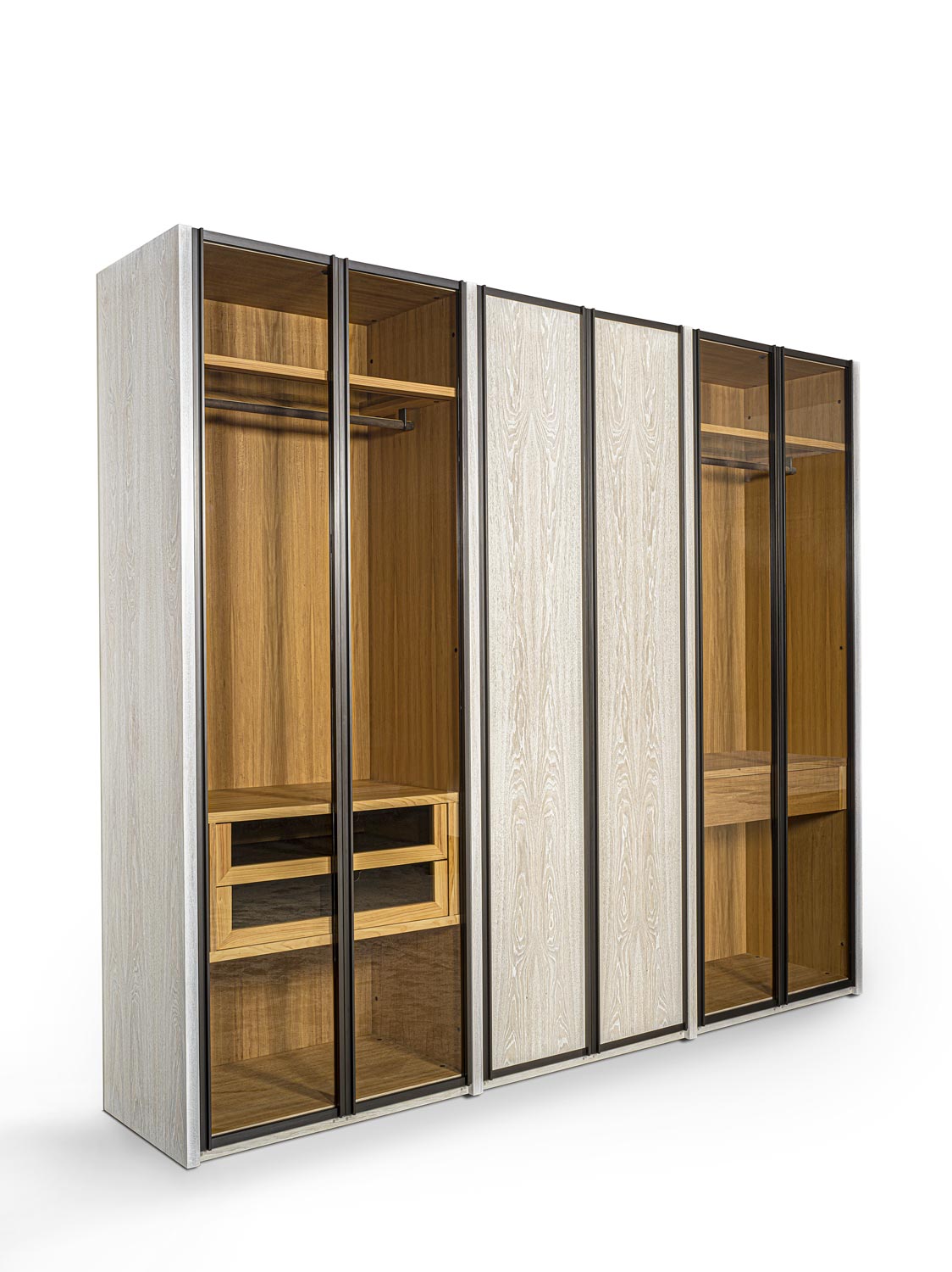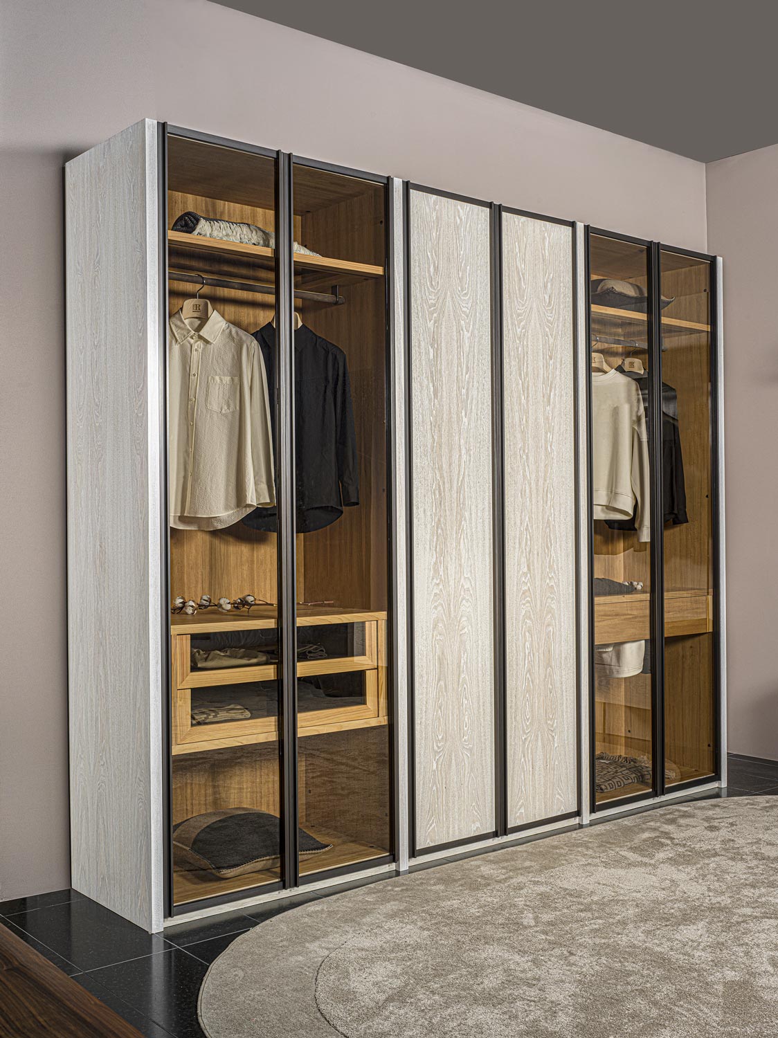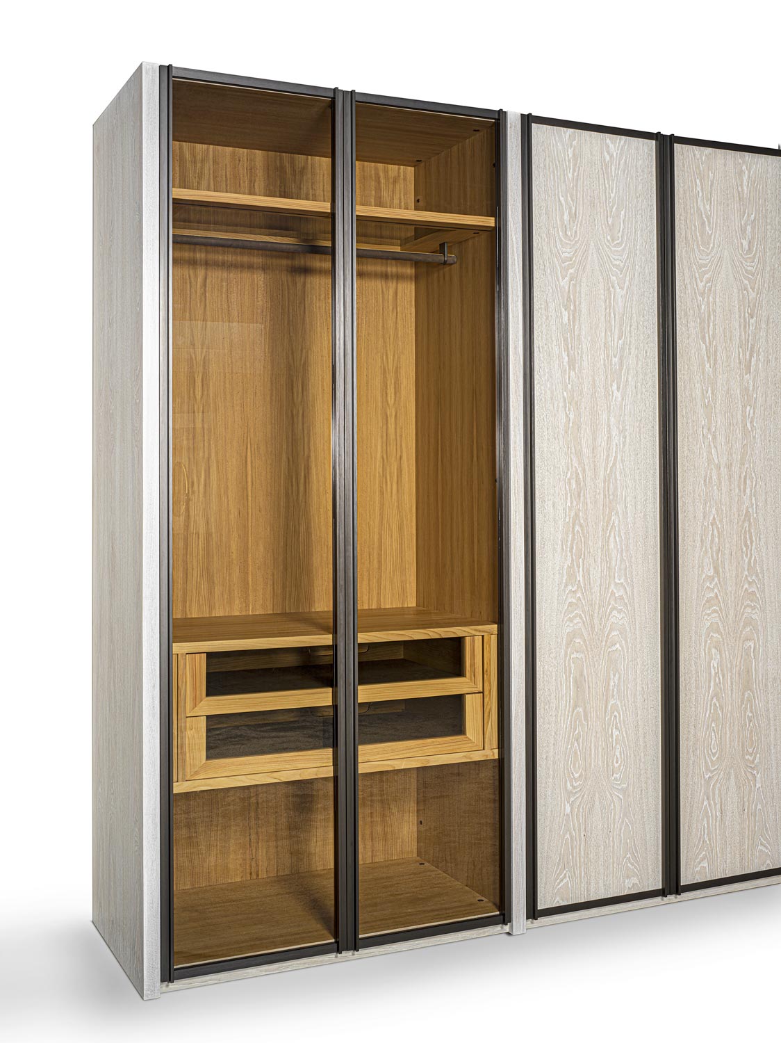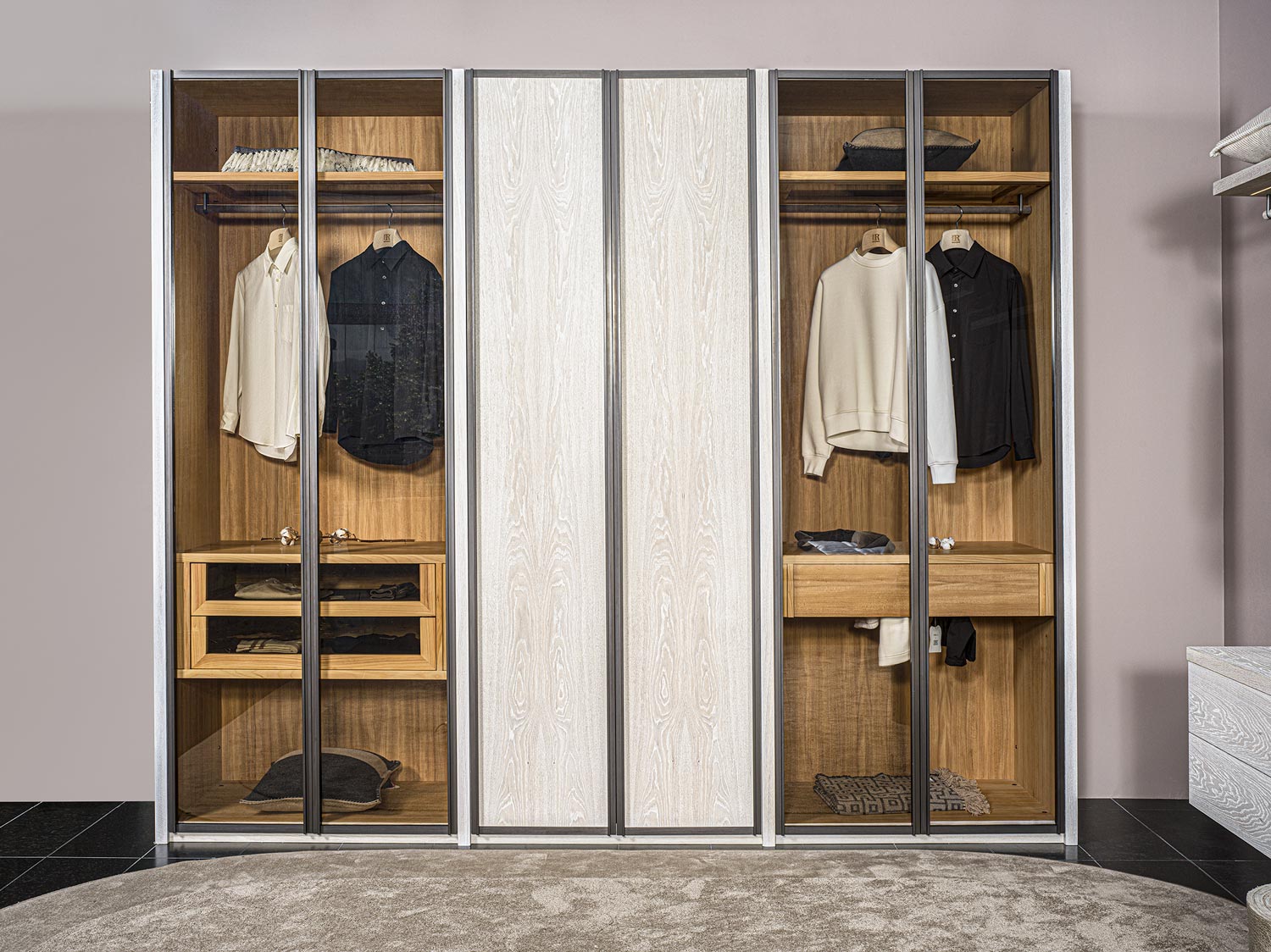 Armadio in listellare e legno massello, con ante a battente in vetro o legno con telaio in alluminio laccato. Il telaio dell'anta, oltre a svolgere una funzione strutturale, è progettato per fungere anche da maniglia, grazie al posizionamento arretrato del vetro. L'armadio propone un’organizzazione funzionale e componibile dei vari elementi sulla base delle esigenze contenitive e delle dimensioni richieste. Personalizzabile con l’inserimento di appendiabiti, ripiani, cassettiere in legno massello con tradizionale incastro a coda di rondine e accessori vari. Ideale con interni in legno di cedro profumato, naturale rimedio contro le tarme. Illuminazione a LED disponibile su richiesta.