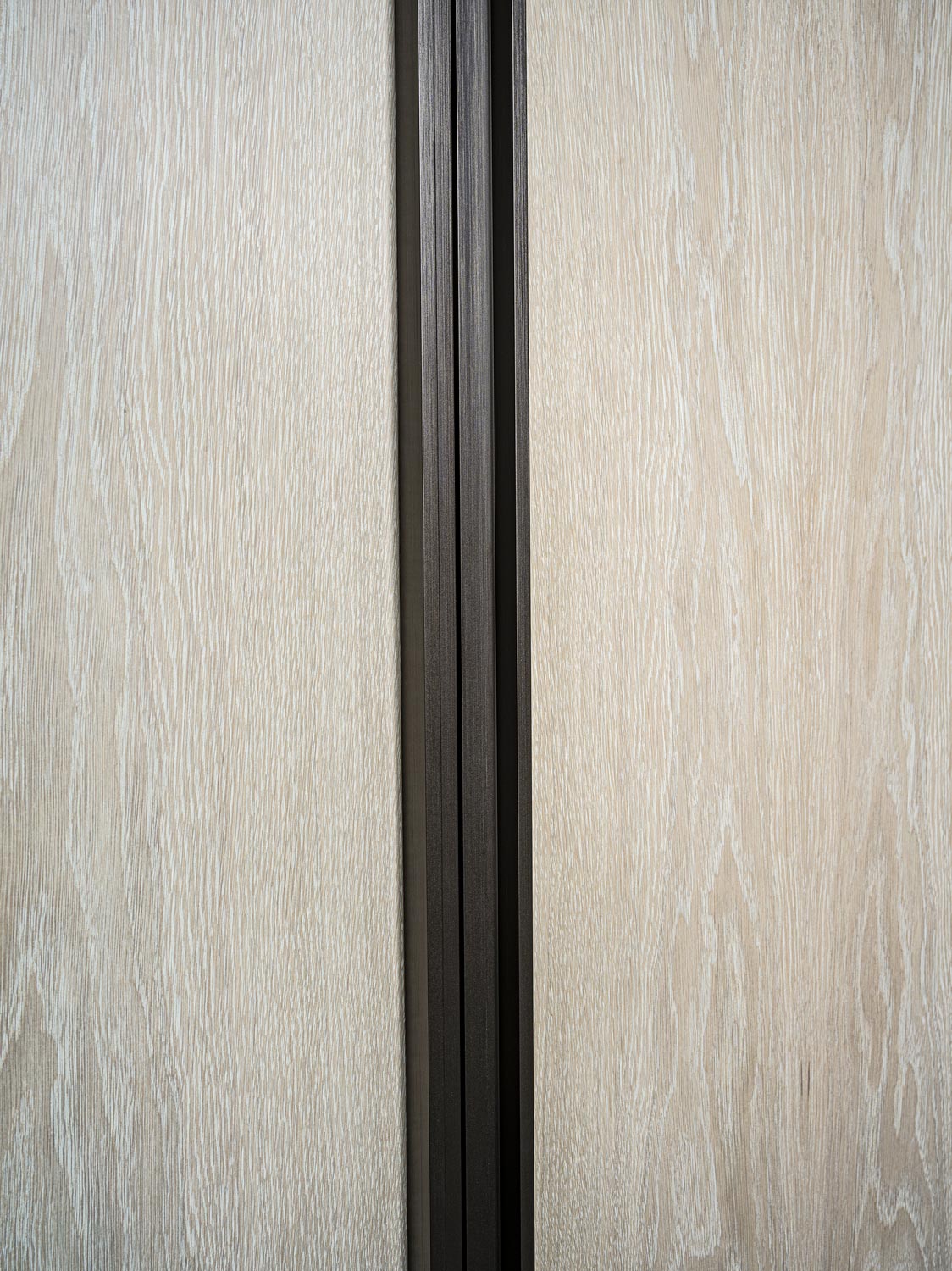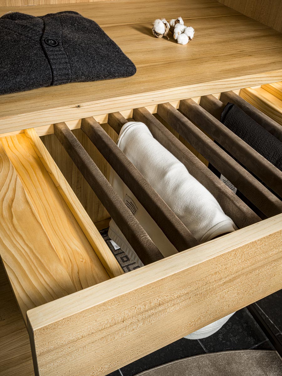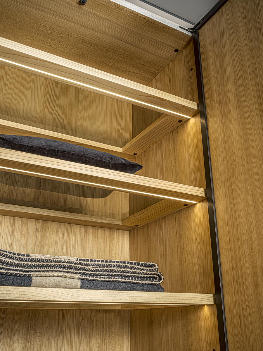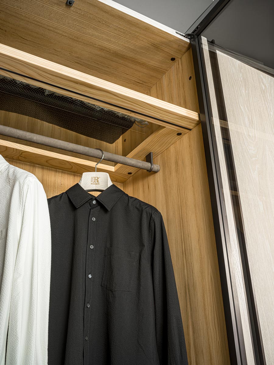 Armadio in listellare e legno massello, con ante a battente in vetro o legno con telaio in alluminio laccato. Il telaio dell'anta, oltre a svolgere una funzione strutturale, è progettato per fungere anche da maniglia, grazie al posizionamento arretrato del vetro. L'armadio propone un’organizzazione funzionale e componibile dei vari elementi sulla base delle esigenze contenitive e delle dimensioni richieste. Personalizzabile con l’inserimento di appendiabiti, ripiani, cassettiere in legno massello con tradizionale incastro a coda di rondine e accessori vari. Ideale con interni in legno di cedro profumato, naturale rimedio contro le tarme. Illuminazione a LED disponibile su richiesta.