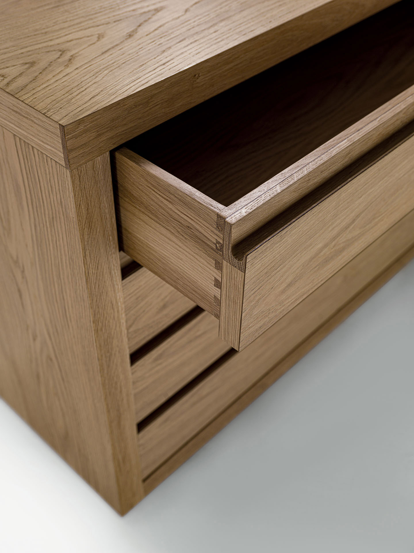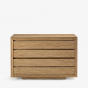 Cassettiera in listellare e legno massello, con 4 cassetti realizzati con tradizionale incastro a coda di rondine.