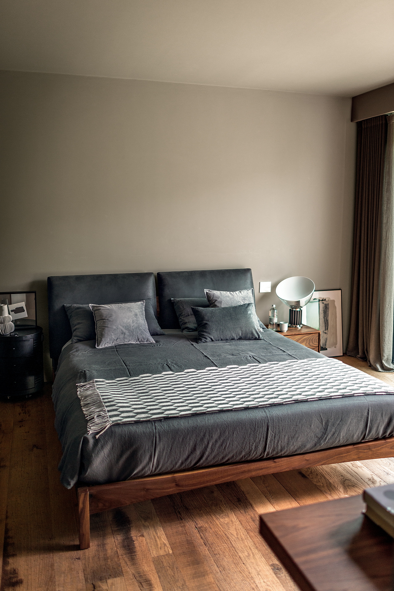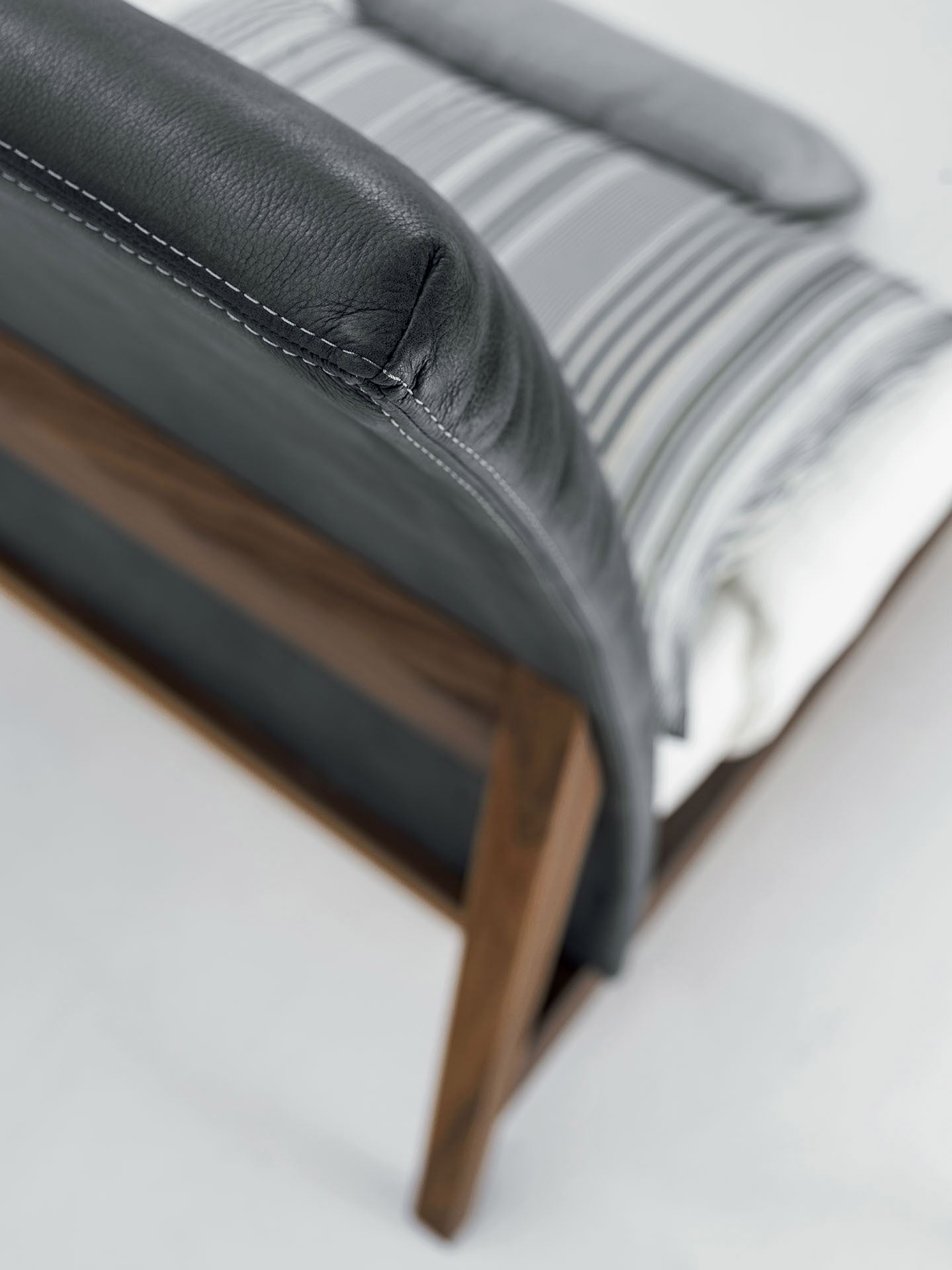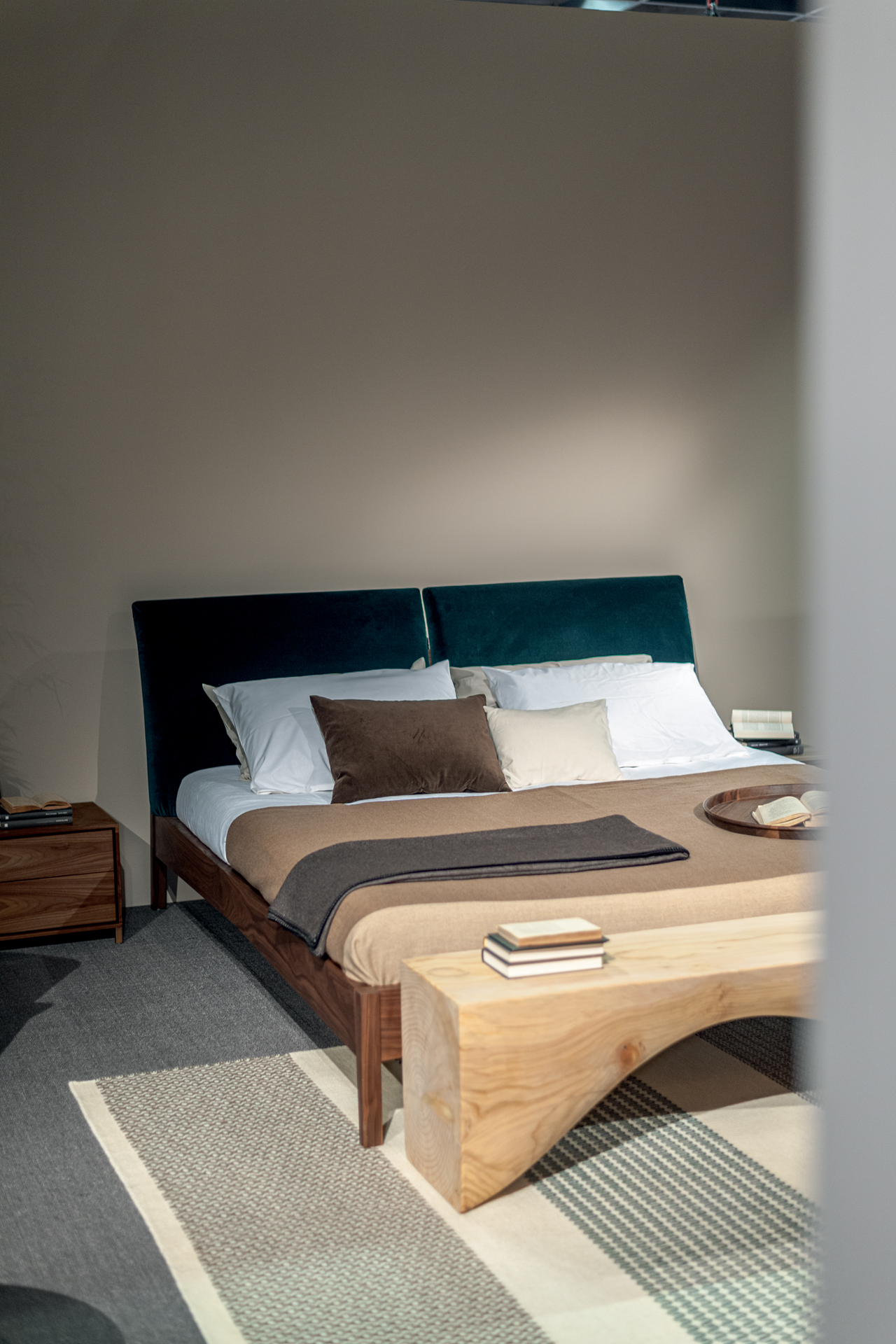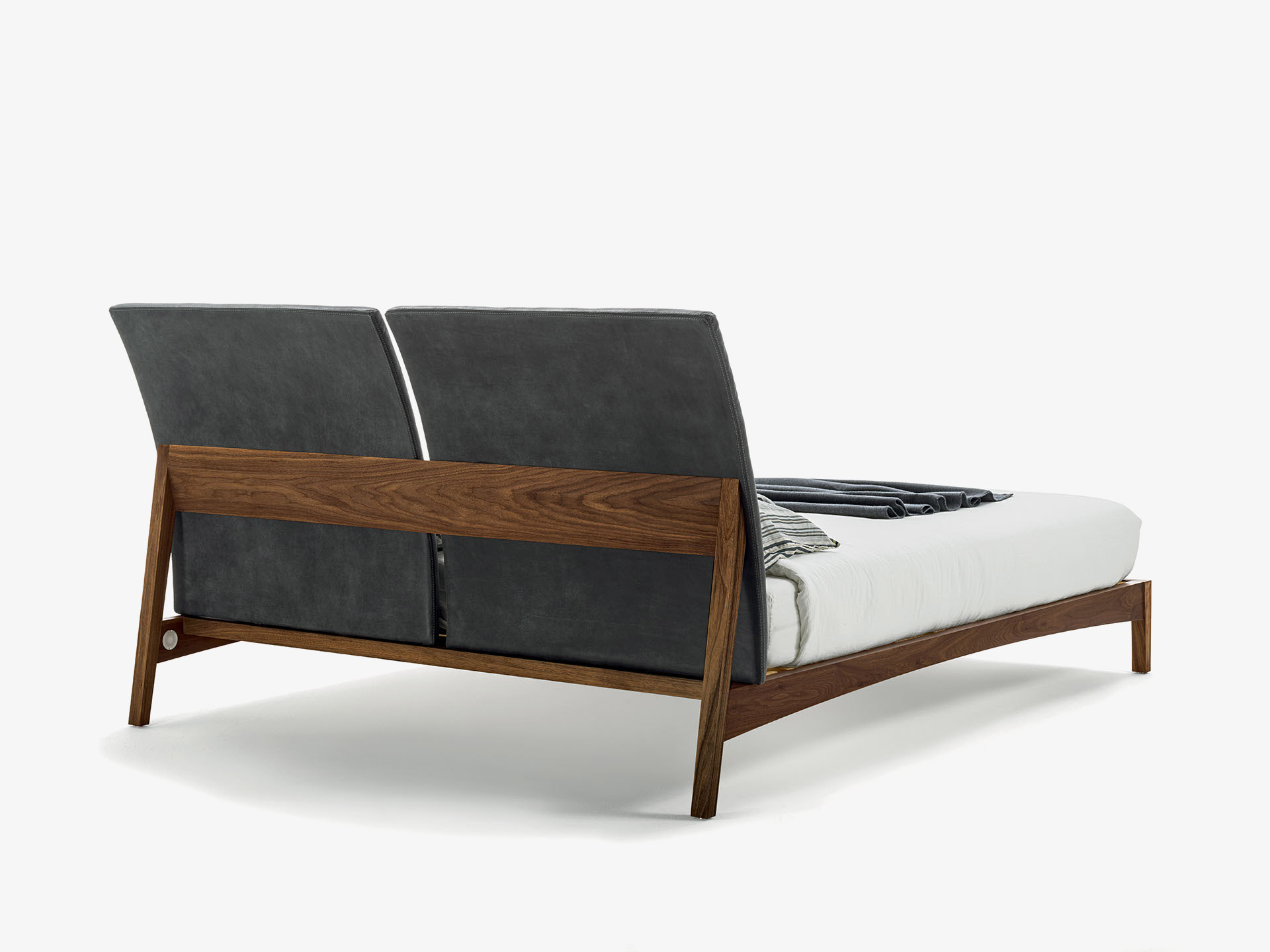Letto con struttura realizzata in legno massello abbinata ad una testata imbottita curvilinea rivestita in pelle o tessuto. Giroletto stondato.