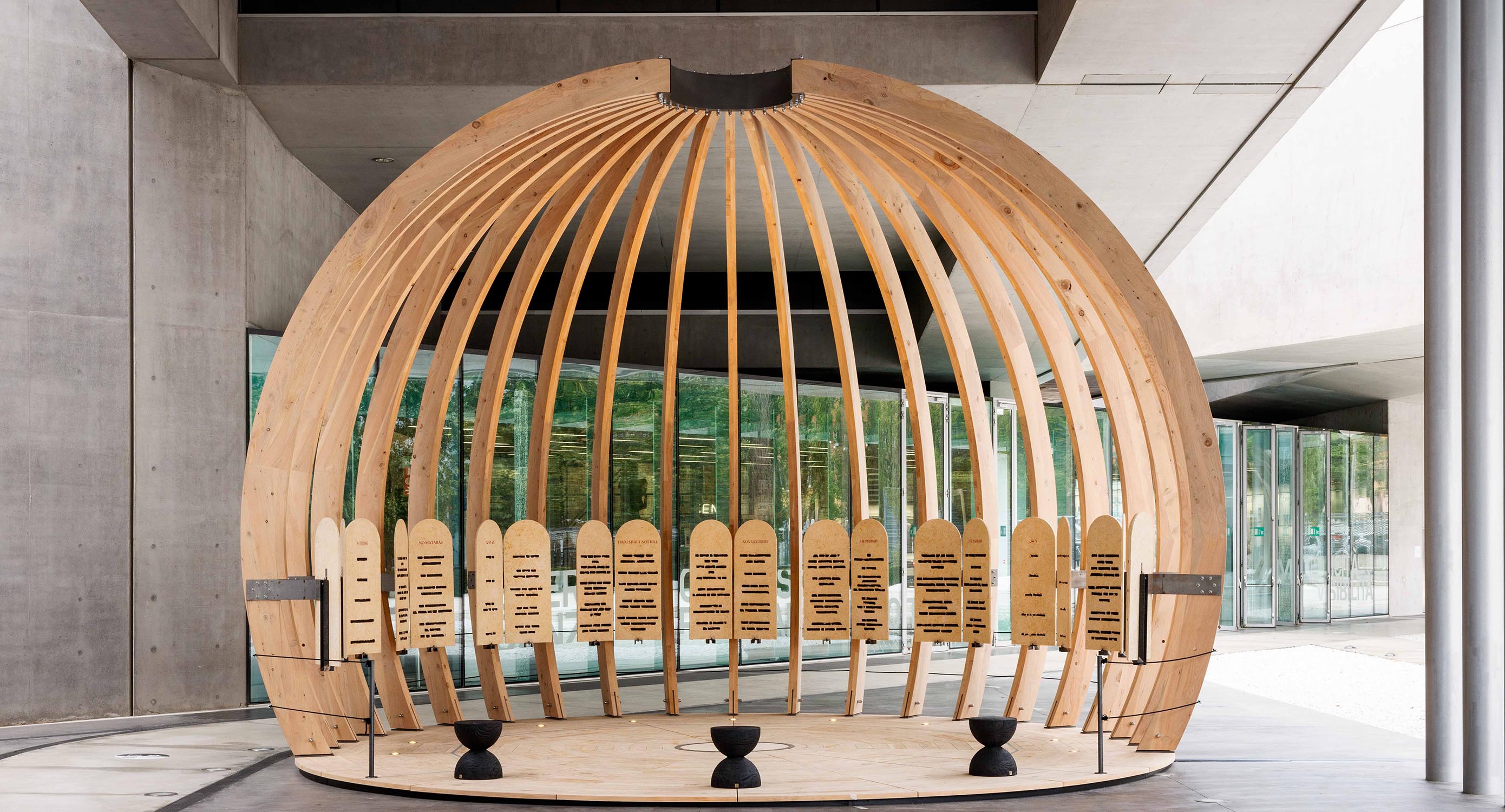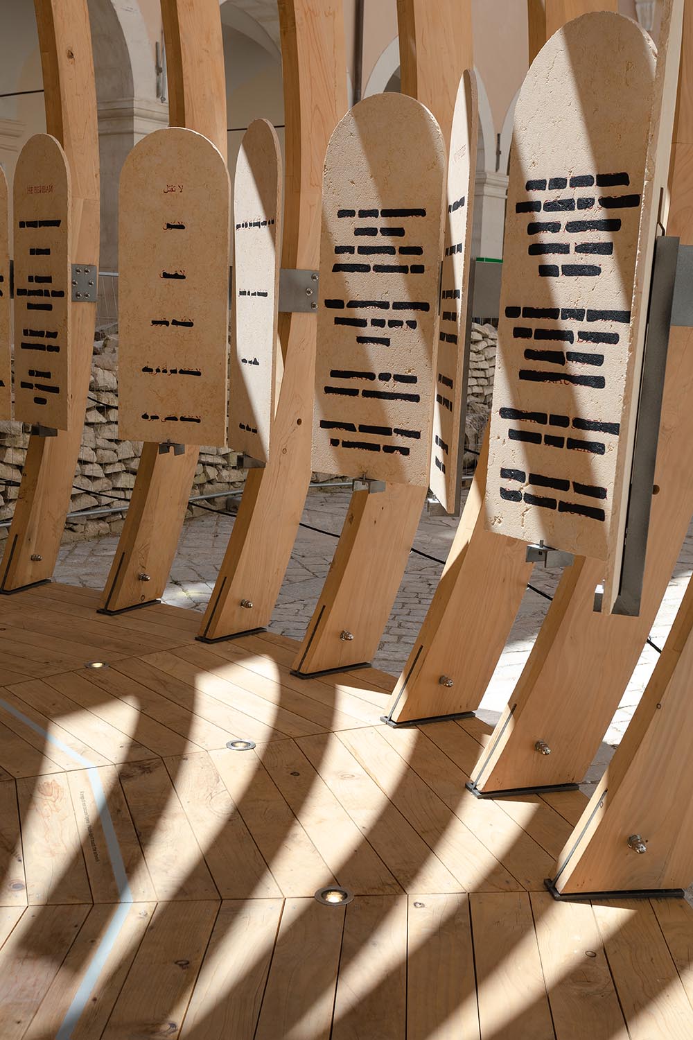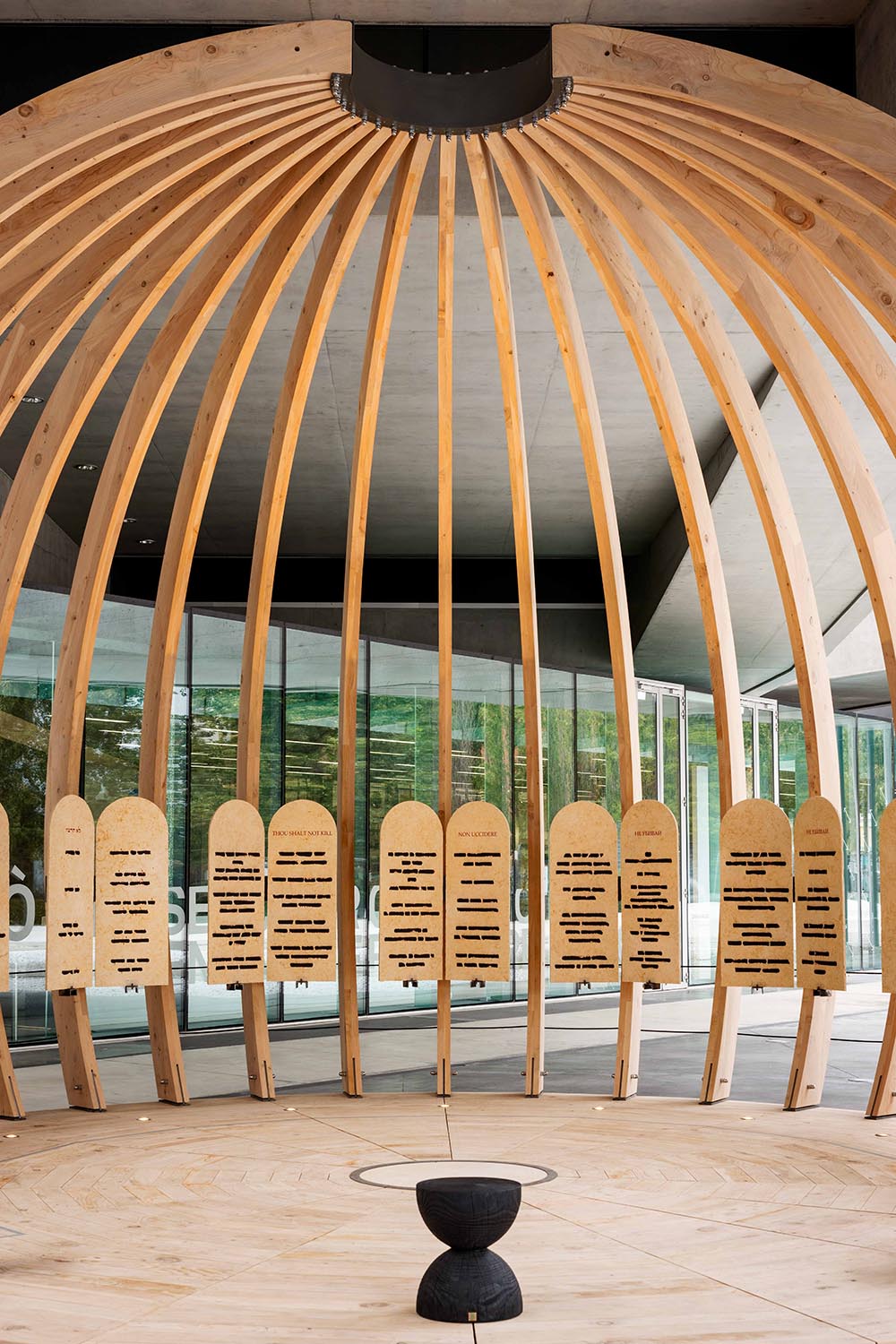 L’opera di Isgrò si manifesta in un monumentale bassorilievo in pietra del Sinai, composto da undici elementi, mentre l’architettura, progettata da Mario Botta, è stata prodotta da Riva1920 in cedro del Libano di recupero e collocata nella grande piazza del Museo.