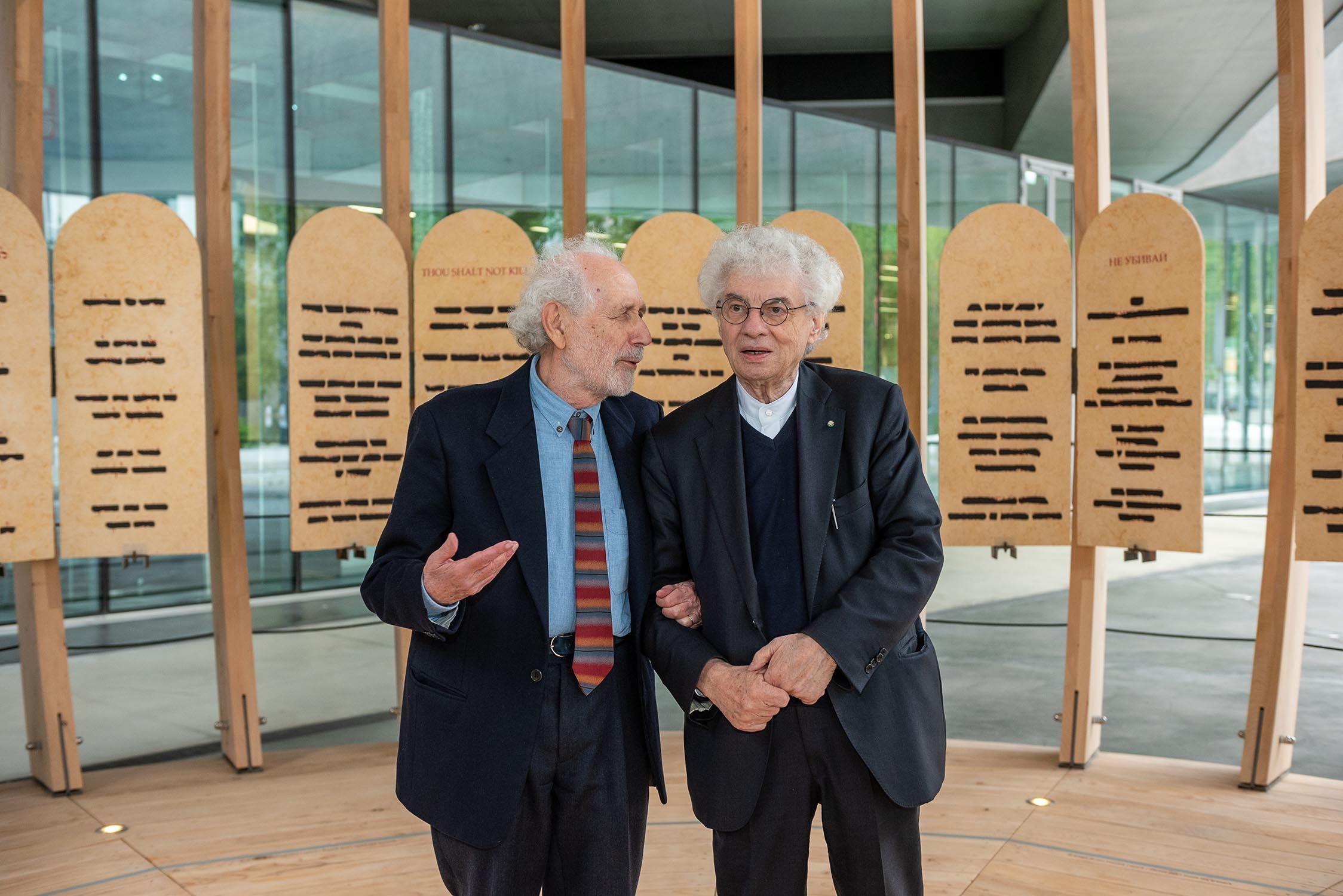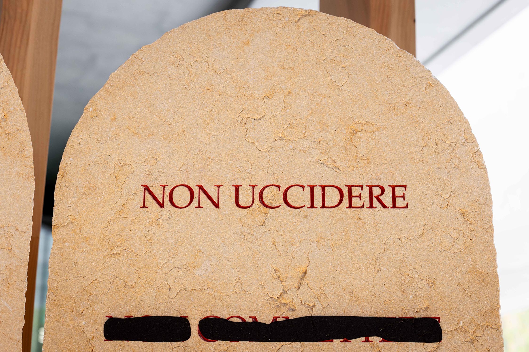 Il lavoro di Emilio Isgrò riflette sui principi della convivenza sociale alla base di tutte le carte costituzionali. L’artista rielabora le tavole bibliche dei Dieci Comandamenti, intesi come fondamento morale della società civile, intervenendo sulle iscrizioni con la cancellatura, cifra distintiva della sua ricerca da quasi sessant’anni, lasciando in evidenza un solo messaggio universale: NON UCCIDERE.