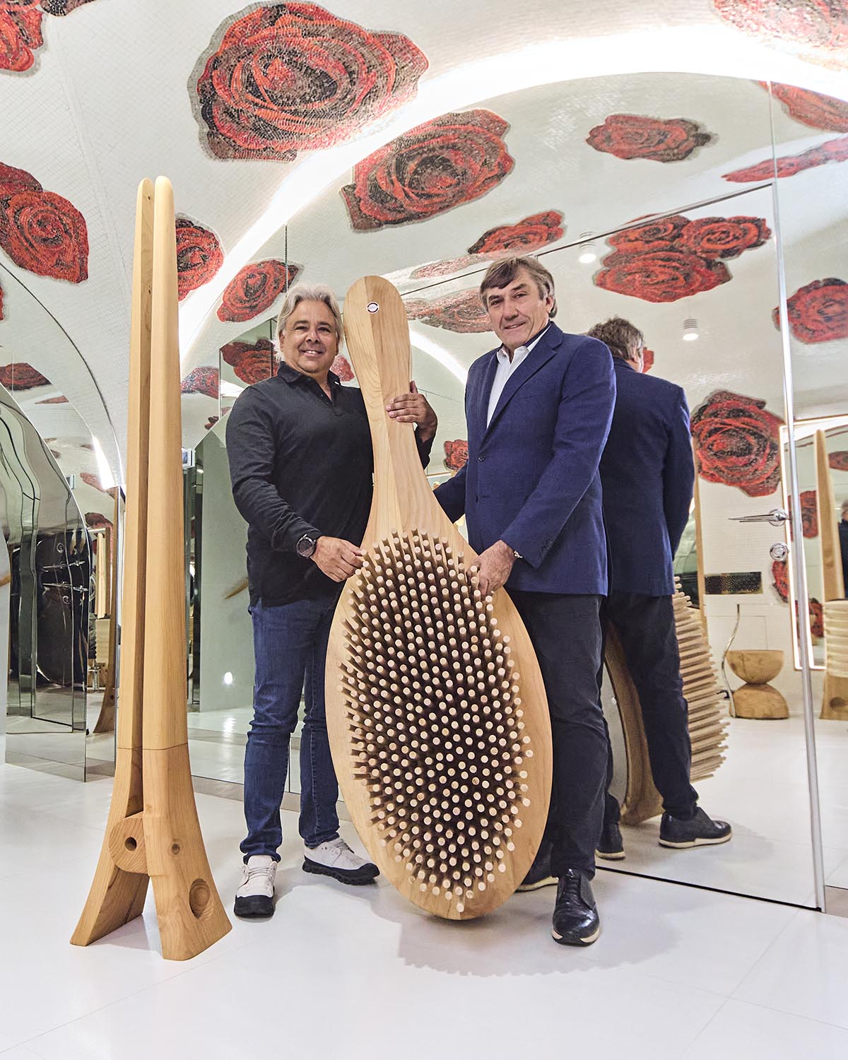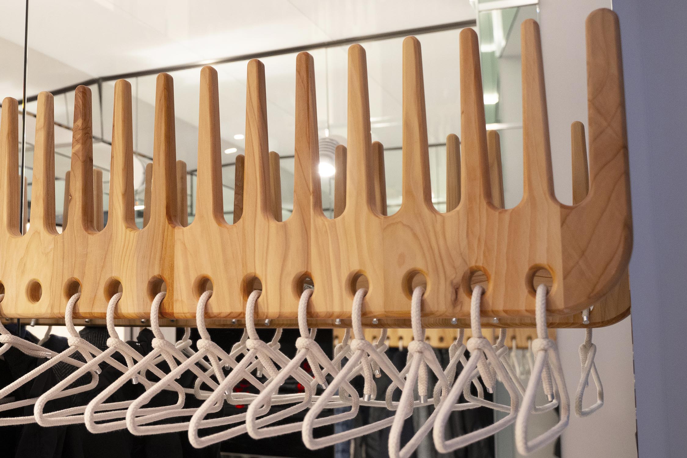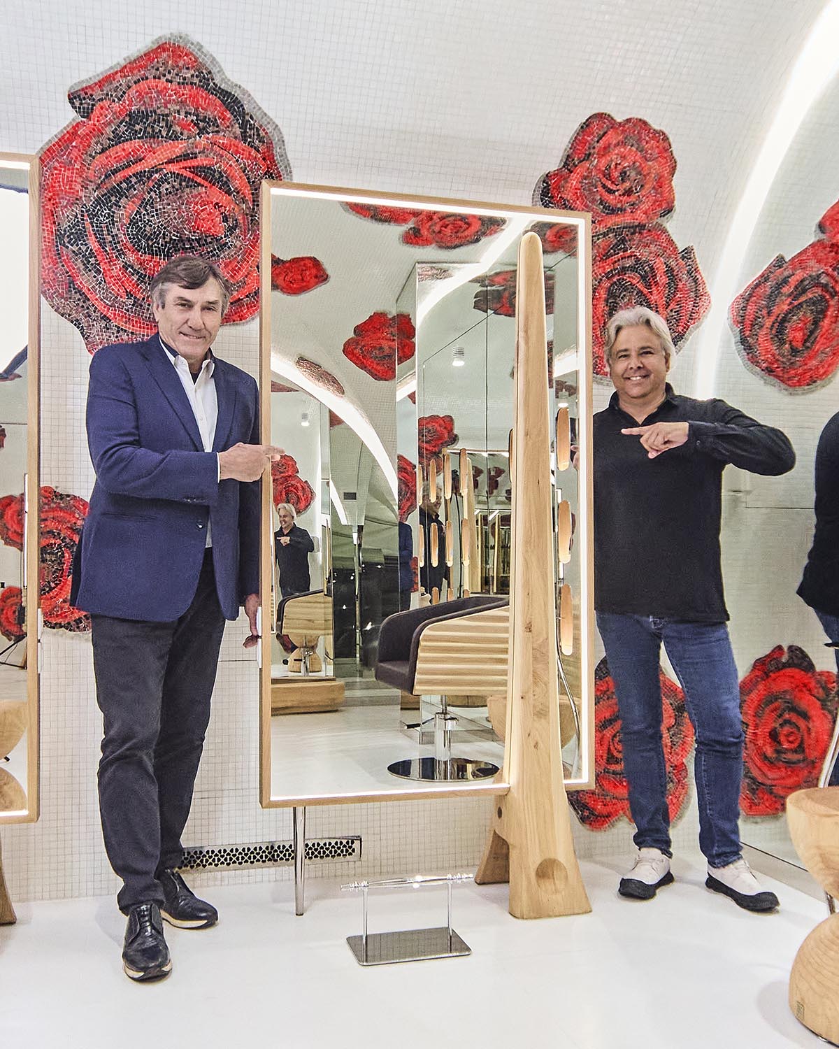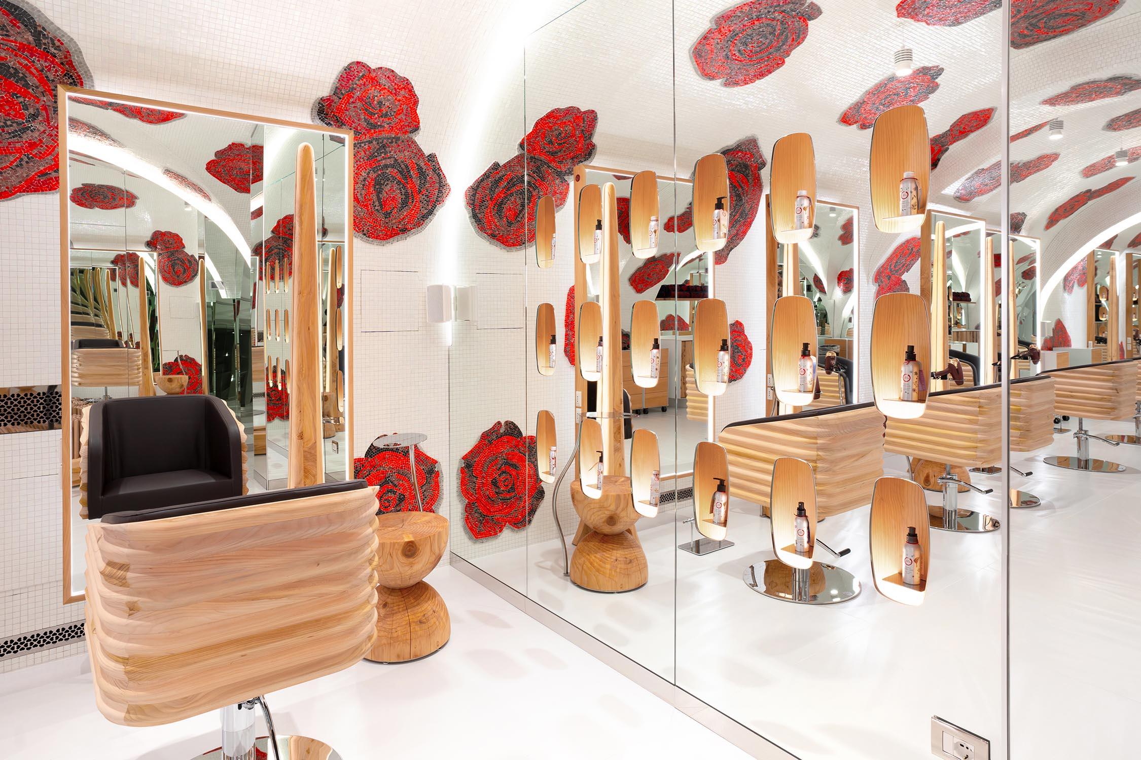 Gli arredi sono realizzati utilizzando materiali di recupero, come le Briccole di Venezia, pali della laguna dal forte valore simbolico e materico, e il cedro del Libano, apprezzato per il suo profumo caratteristico. Quest’ultimo è stato impiegato per la realizzazione di postazioni di lavoro con specchiere BEKKUCCIO, divanetti d’attesa a forma di spazzola AUDREY, ispirati all’iconica spazzola Aldo Coppola, le nuove poltrone KOMODA, che uniscono design e comfort, e il mobile guardaroba LA PETTINEUSE, un grande pettine porta abiti.