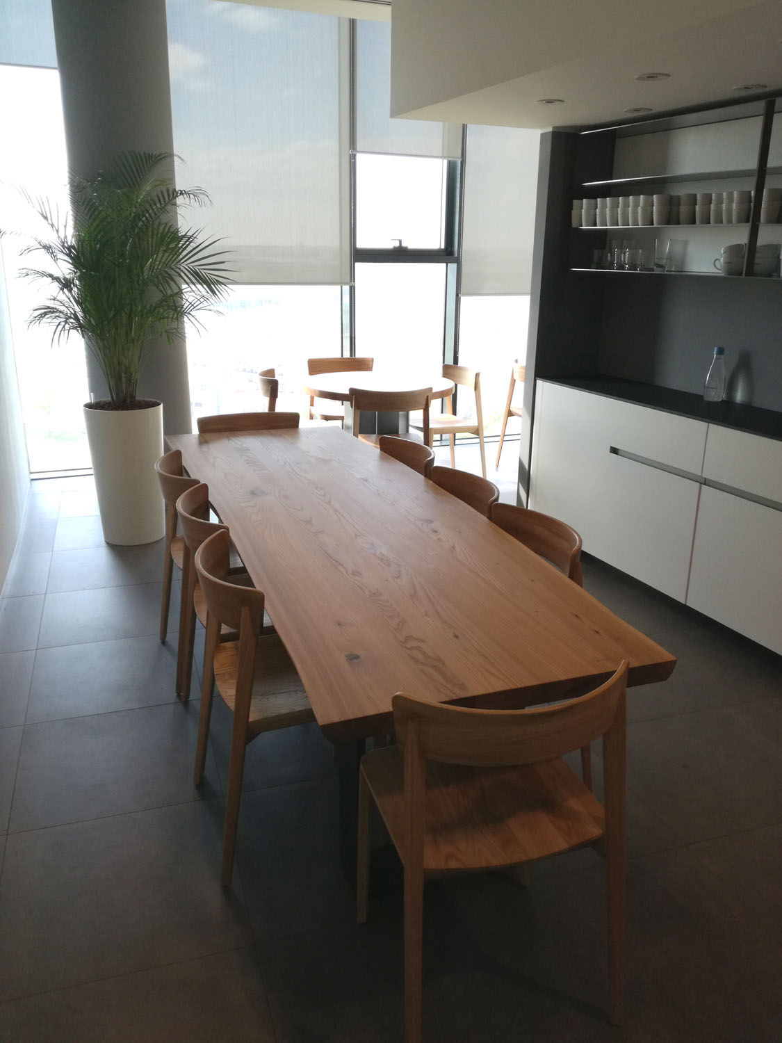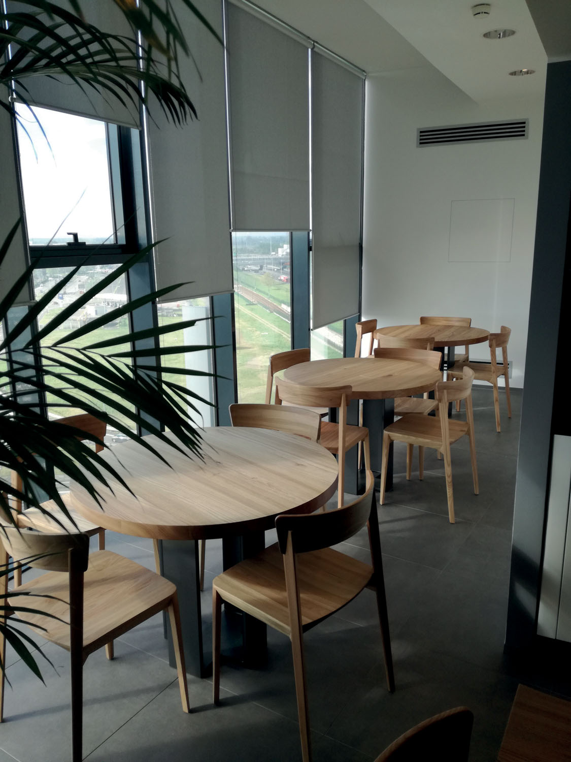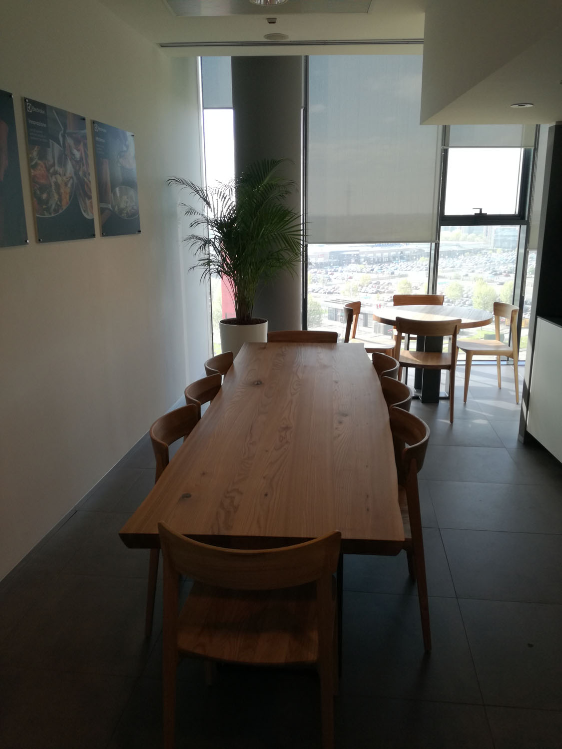 La collaborazione tra Riva1920 ed il rinomato marchio di elettrodomestici Electrolux vede l'accostamento di sedute e tavoli dal design essenziale e pulito, realizzati in legno massello di grande pregio, per arredare con stile ed eleganza gli uffici della sede milanese.