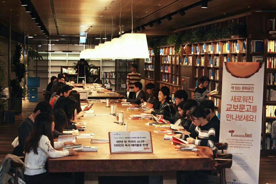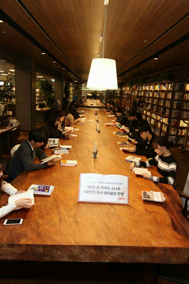 Kyobo Book Store è una libreria nata nel 1980 nel centro storico di Seoul (Gwanghwamun). L’obiettivo di questo spazio è promuovere la cultura attraverso la lettura, basti considerare che negli anni sono stati venduti oltre 400 milioni di libri. L’allestimento dello spazio prevede due tavoli da 12 metri realizzati in legno millenario di Kauri sui quali si possono accomodare contemporaneamente 100 persone.